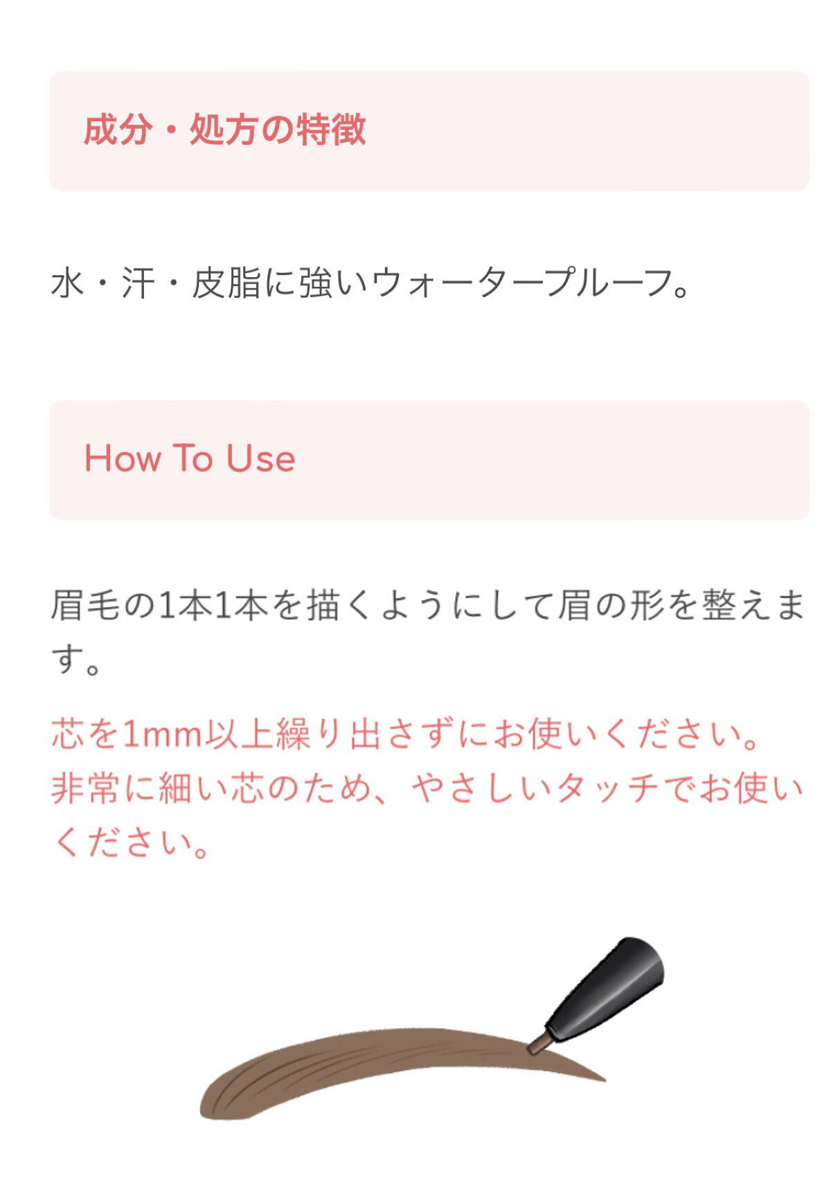 - 眉尻の1本1本まで描ける0.9mmのアイブロウ。 眉毛1本1本を描きやすく、眉尻も繊細に描ける超細芯。 力を入れなくてもしっかり描ける美発色タイプ。 水・汗・皮脂に強いウォータープルーフ。