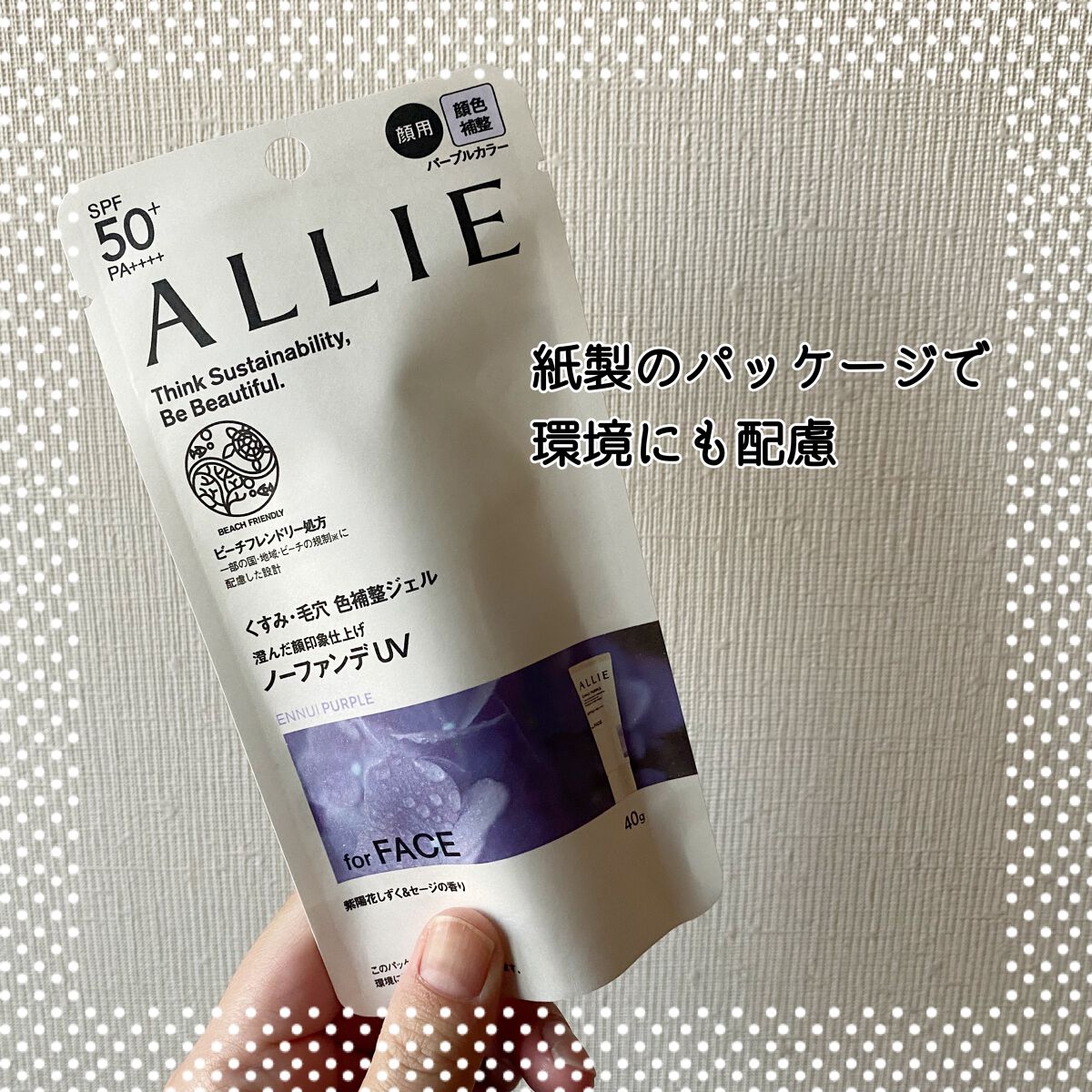- 世界を想う 美しさつづく*1 日やけ止め おでかけも、マスクを外す機会も増える毎日に。 一部の国・地域・ビーチの規制に配慮した設計のビーチフレンドリー処方。 これ 1 本で、UV カット&顔色補整効果でクマ・くすみ・色ムラまでカバー! テカりにくく、くずれにくいノーファンデ UV*2 【ENNUI PURPLE】 くすみや毛穴をカバー 儚げな透明感のある顔印象続く 澄んだ気分を誘う 紫陽花しずく&セージの香り 【SUNNY APRICOT】 クマや毛穴をカバー いきいきとした血色感のある顔印象つづく 思わず出かけたくなる アプリコット&金木犀の香り 【SHERR BEIGE】 色ムラや毛穴をカバー 均一で抜け感のある顔印象つづく 自然で飾らない シトラスウッディ&パチュリの香り ●一部の国・地域・ビーチの規制に配慮した設計の「ビーチフレンドリー処方」 ●SPF50+・PA++++ ●汗・水 こすれに強く落ちにくい フリクションプルーフ・スーパーウォータープルーフ ●ベタつきにくい感触がつづく ●テカりにくくキレイな肌仕上がりがつづく ●環境に配慮した素材を使用したパッケージ採用 ●美容液成分(保湿)ヒアルロン酸Na配合 ●顔用 ●普段のメイククレンジングで落とせる ●マスク・タオル等につきにくい ●化粧下地効果 *1 スキンケア効果またはメイクアップ効果による肌仕上がりのこと *2 ファンデーション未使用時でも、自然なベースメイクが仕上がる日やけ止めのこと *3 チリ・ほこり・PM2.5・花粉等すべての微粒子汚れの付着を防ぐわけではありません 01:ENNUI PURPLE パープル 02:SUNNY APRICOT アプリコットピンク 03:SHEER BEIGE ミルキーベージュ