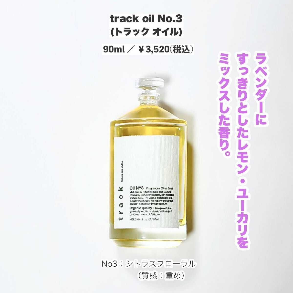 - ■track oil No1(天然由来成分100%)フレッシュシトラスの香り 優しいツヤとうるおいで上品な素髪感を ■track oil No2(天然由来成分99.2%)シトラスハーブの香り 凛としたツヤとみずみずしさで端正な印象を ■track oil No3(天然由来成分99.19%)シトラスフローラルの香り 息づくツヤと深いうるおいでまとまりある表情を