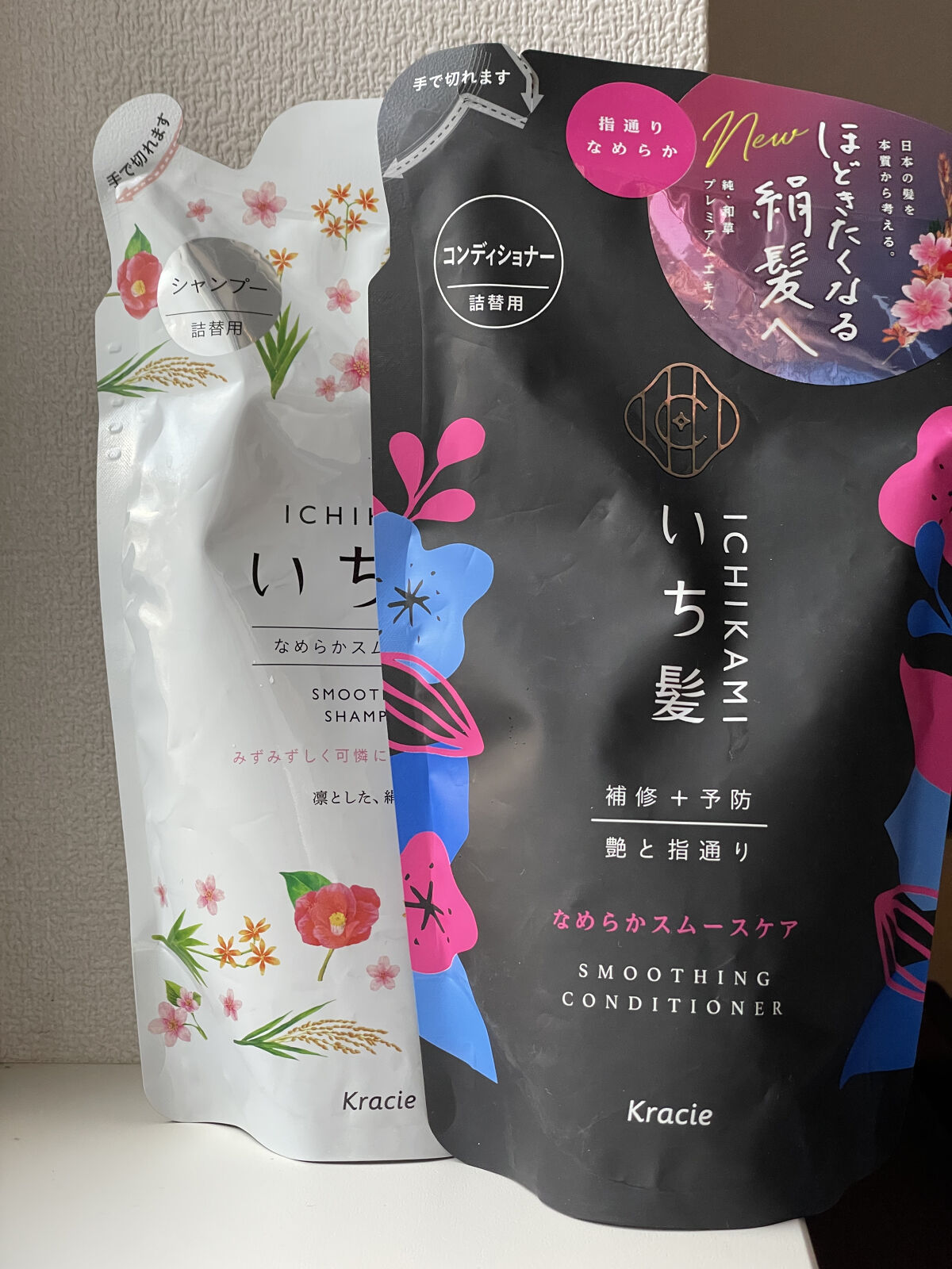 いち髪 なめらかスムースケア シャンプー480ml コンディショナー480g久しぶりのいち髪!!セットで800〜900円くらいでした😳1週間ちょい使った感想です。シャンプーはみずみずしく可憐な山桜 三分咲きの香り🌸泡立ちは普通かな🫧流すと髪が...