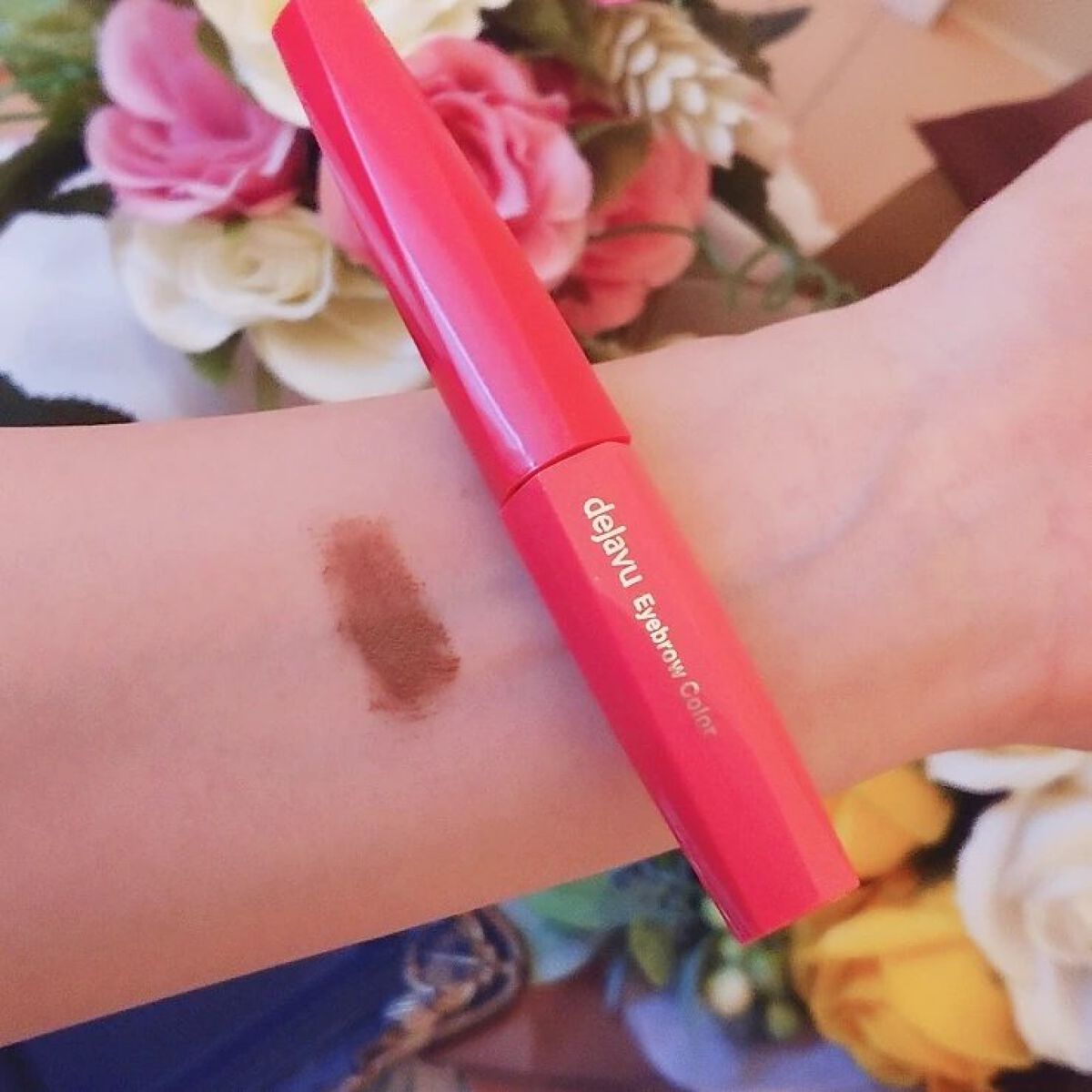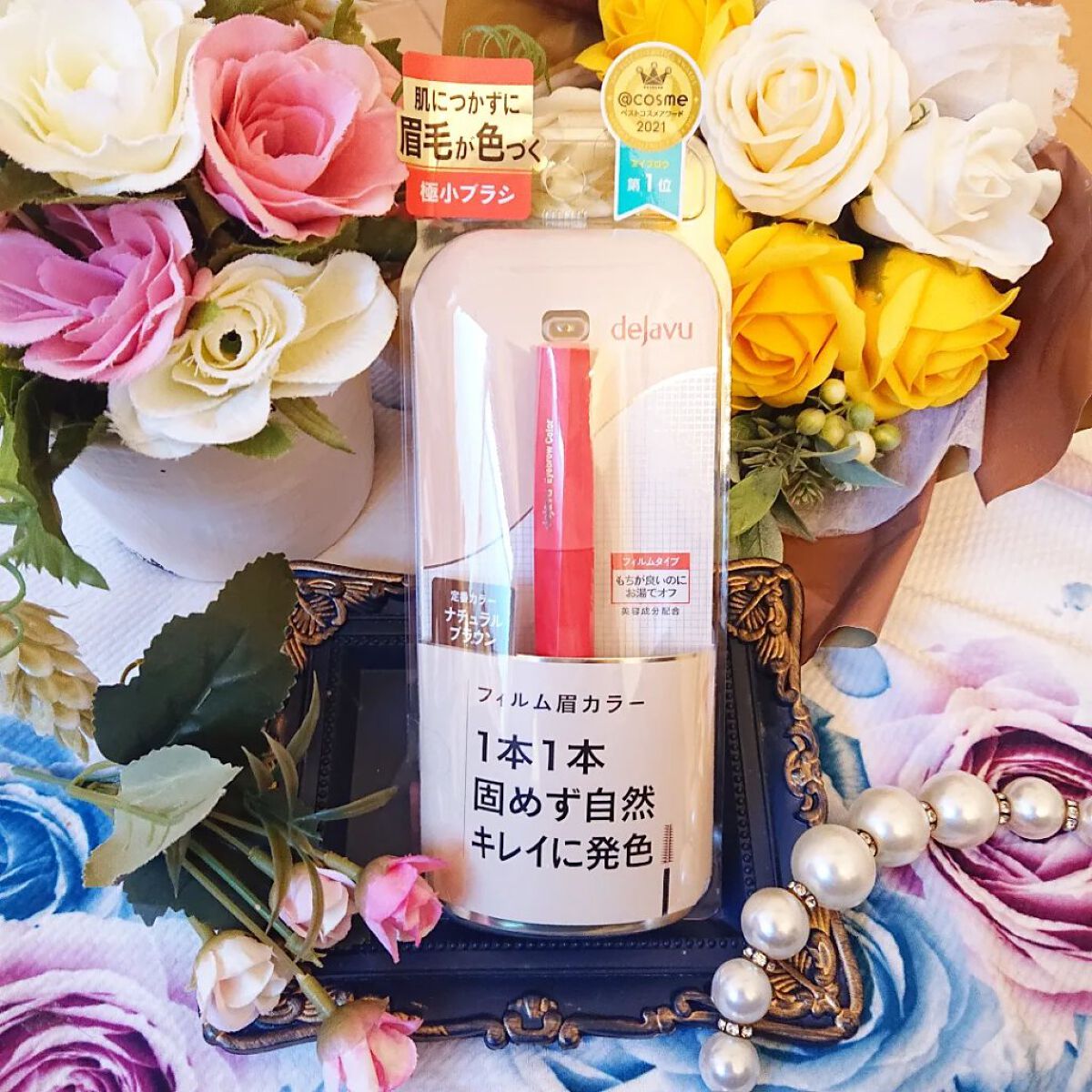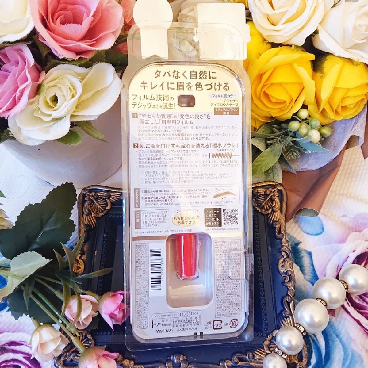 1本1本色づき固まらない「フィルム眉カラー」 塗りやすい極小ブラシで簡単垢抜け✨ デジャヴュ独自の薄膜フィルムを採用。 毛がパリッと固まらず、タバやダマのないふんわり自然な眉に。 フィルムタイプで速乾性が高く、皮脂・汗・こすれに強いのに、お湯だけで簡単に落とせます✨
