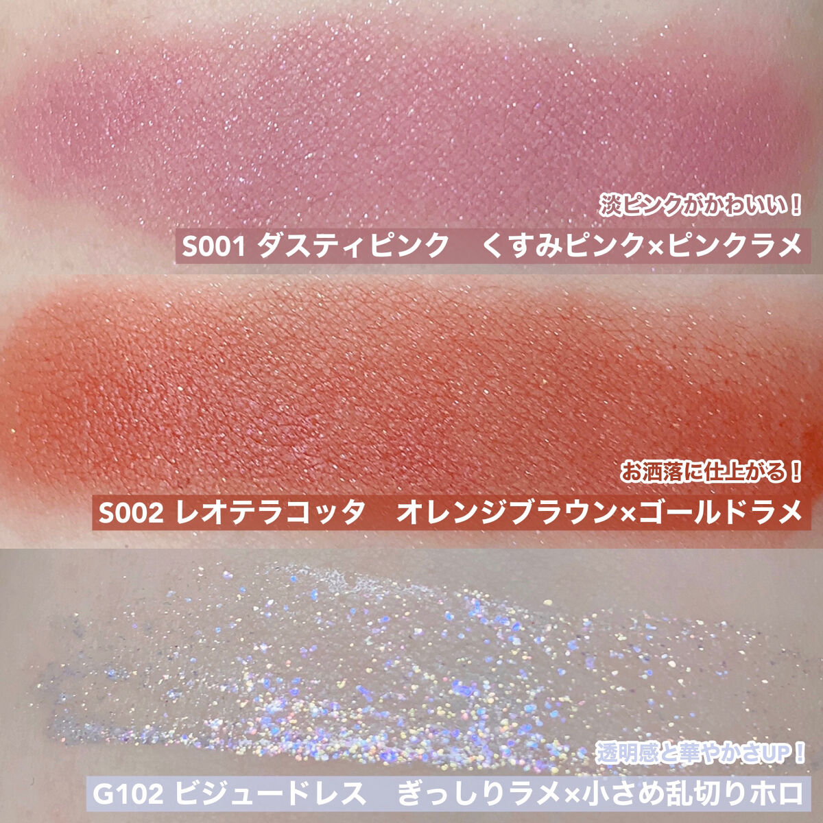 - 高発色×高密着×ラメ感持続のリキッドアイシャドウ。 セミマット・パール・グリッターの3タイプで異なる質感を楽しめます。 密着性の高い柔らかなジェルとサラサラのコートが肌にフィットし、まばたきしてもヨレにくい目元を叶えます。