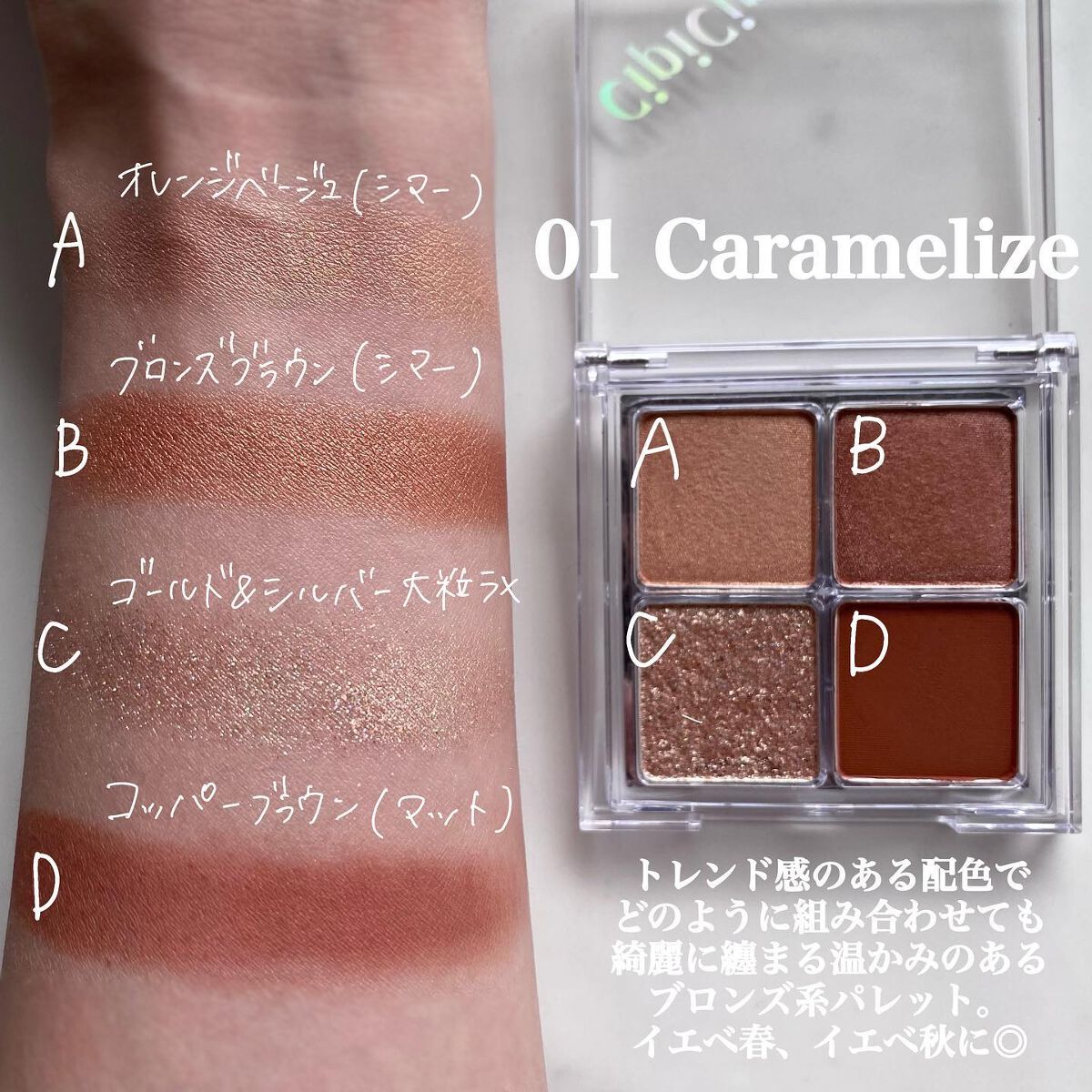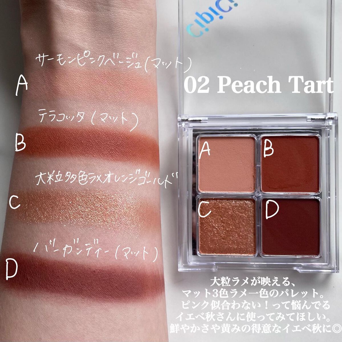 - 立体感ある目元に 質感MIXアイシャドウパレット グリッター、シアー、マット。異なる質感を組み合わせれば、簡単に立体感のある目元が完成♡ 発色バツグン しっとりなオイルリッチ処方 美容液成分6種類※1配合で目元ケア ※1 アルガニアスピノサ核油、セラミドNP、加水分解コラーゲン、ホホバ種子油、ヒアルロン酸Na、ザクロ果実エキス