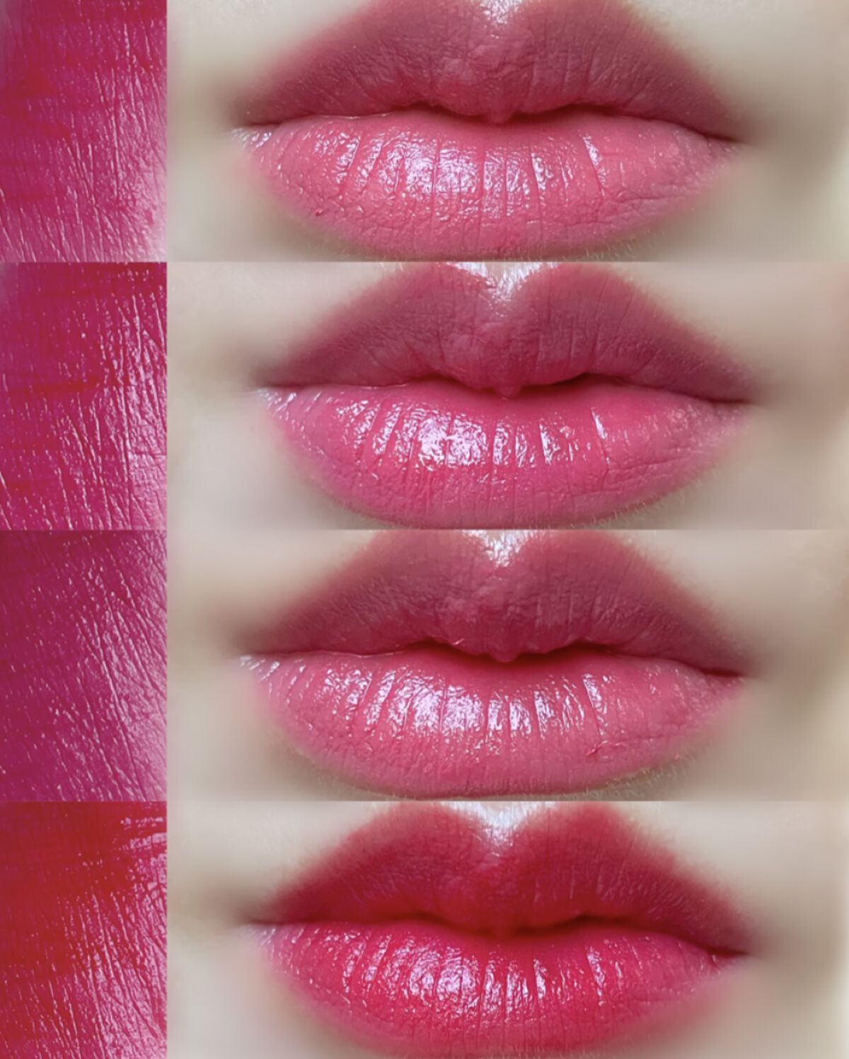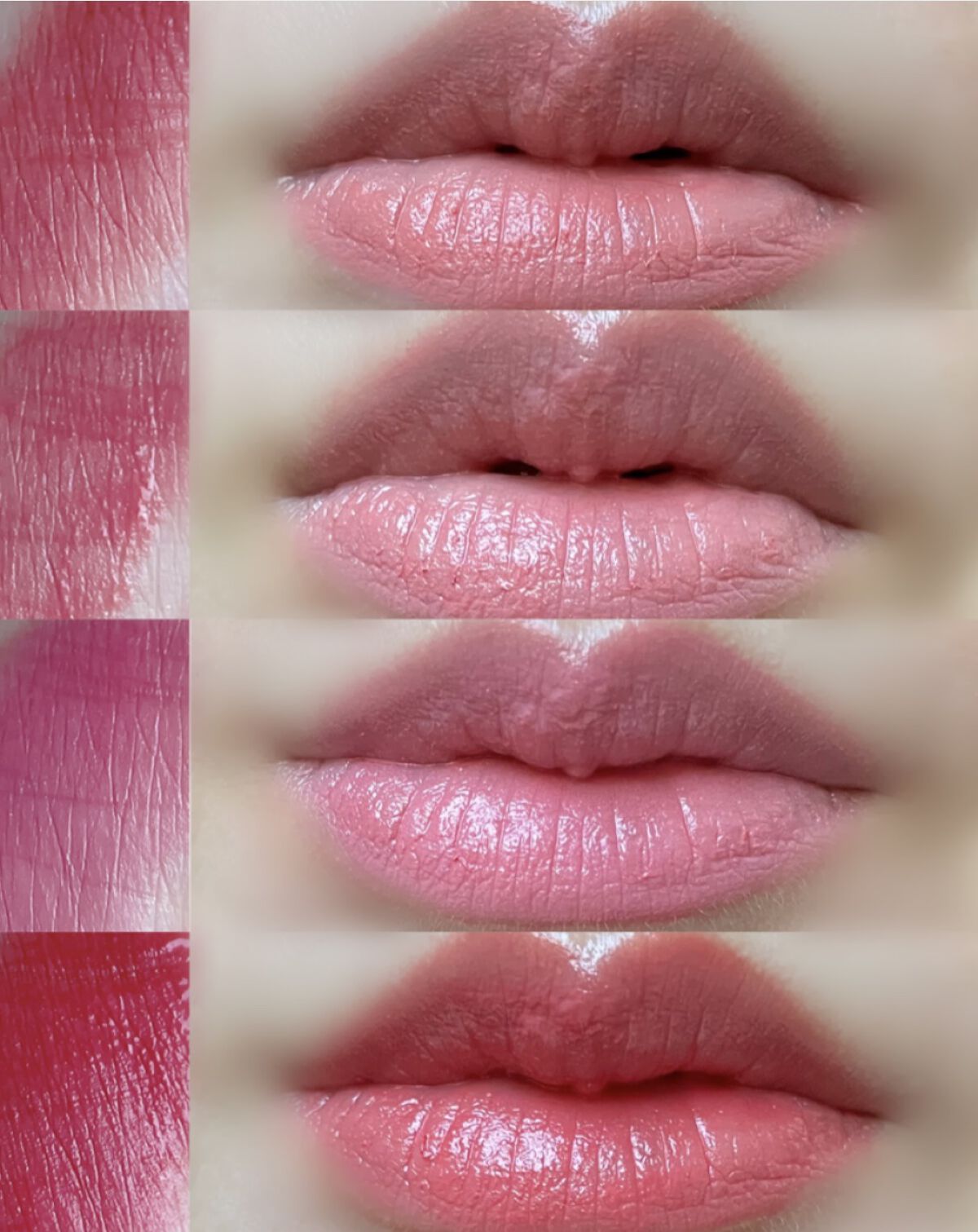 透明感のある発色で艶々なのにベタつかず軽いつけ心地✨時間が経っても乾燥なし! 唇にしっかり着色してカラーの持続力がすごい💗 一度塗りでは肌馴染みの良いシアーな発色で重ね塗りするとカラーがはっきりとしてまた一味違った印象に😍