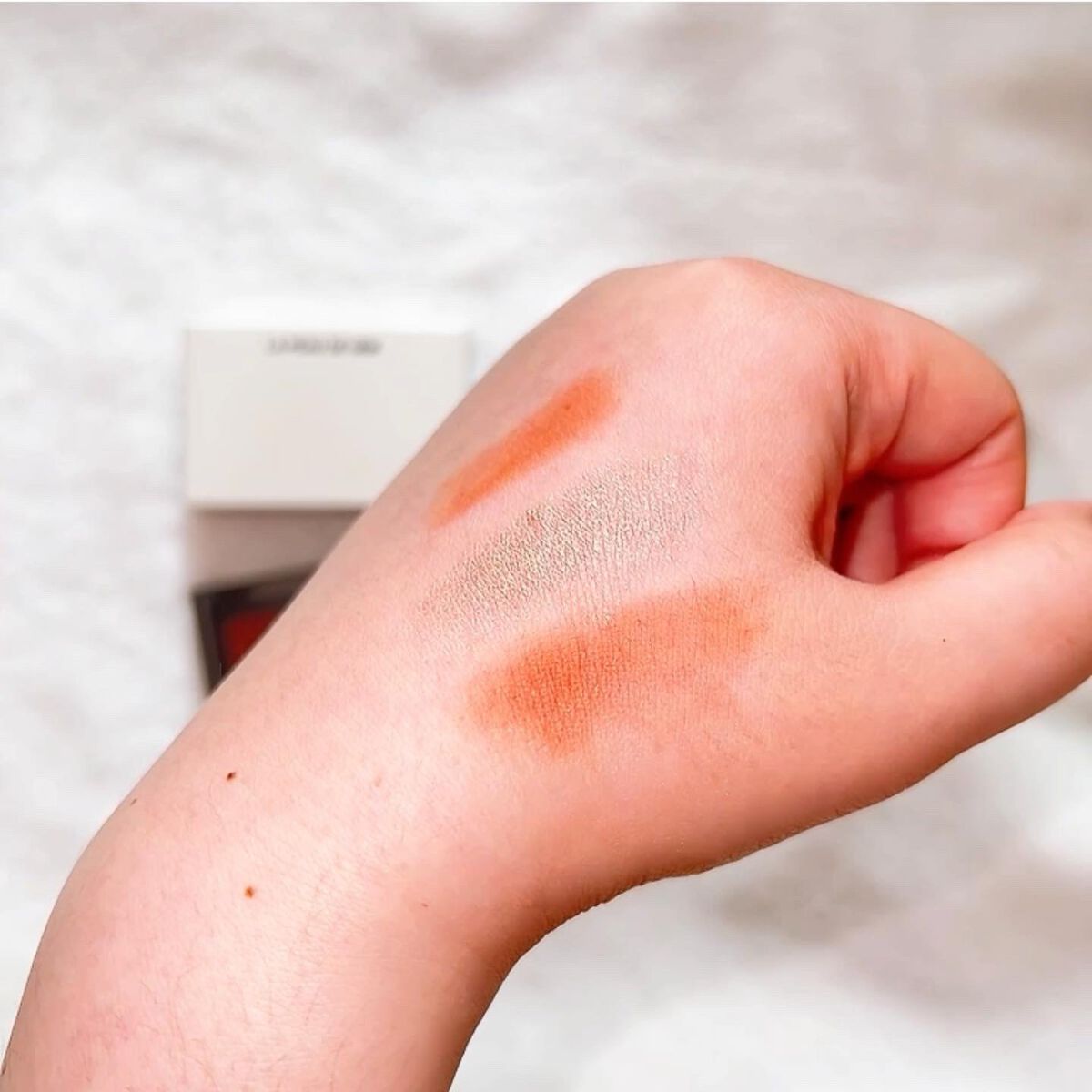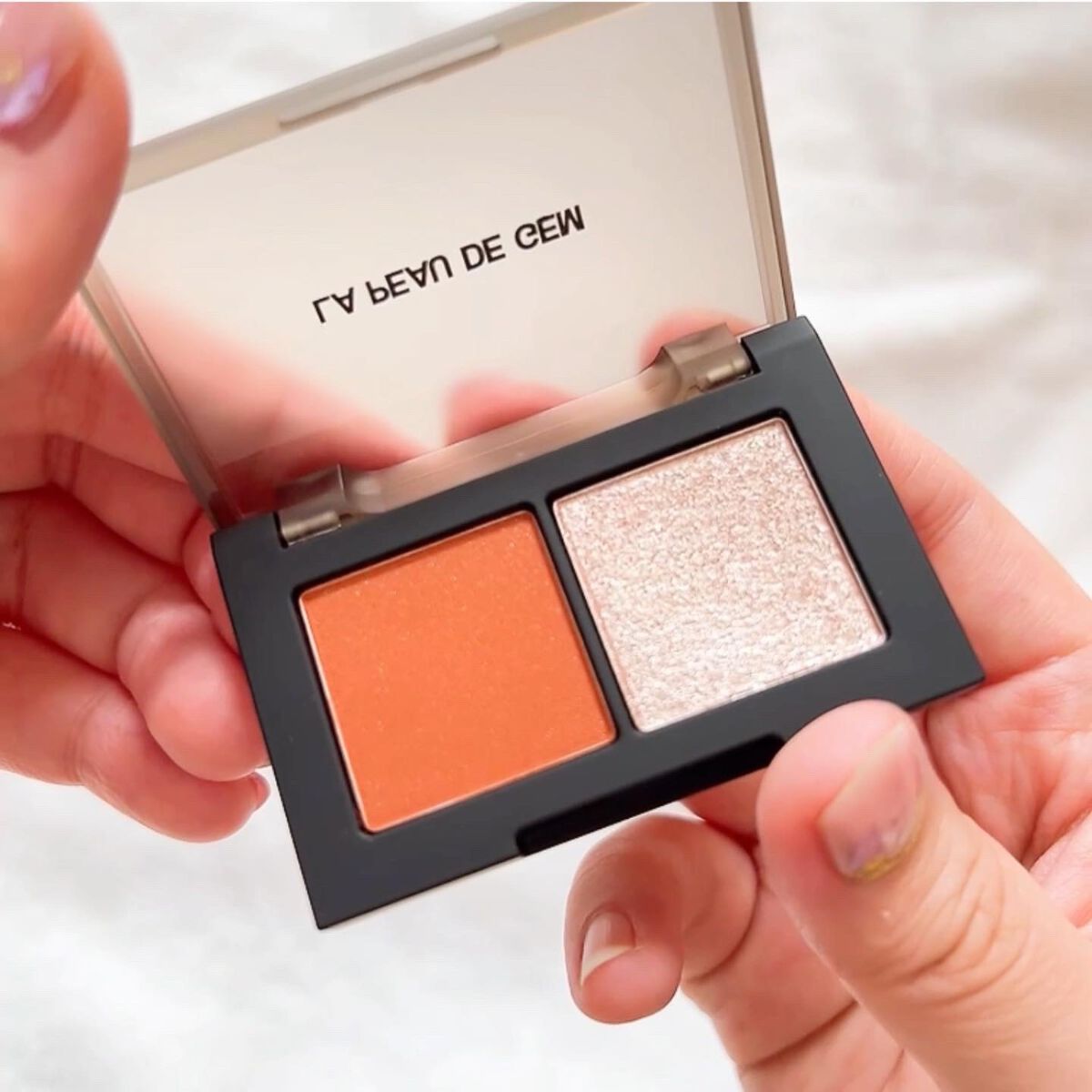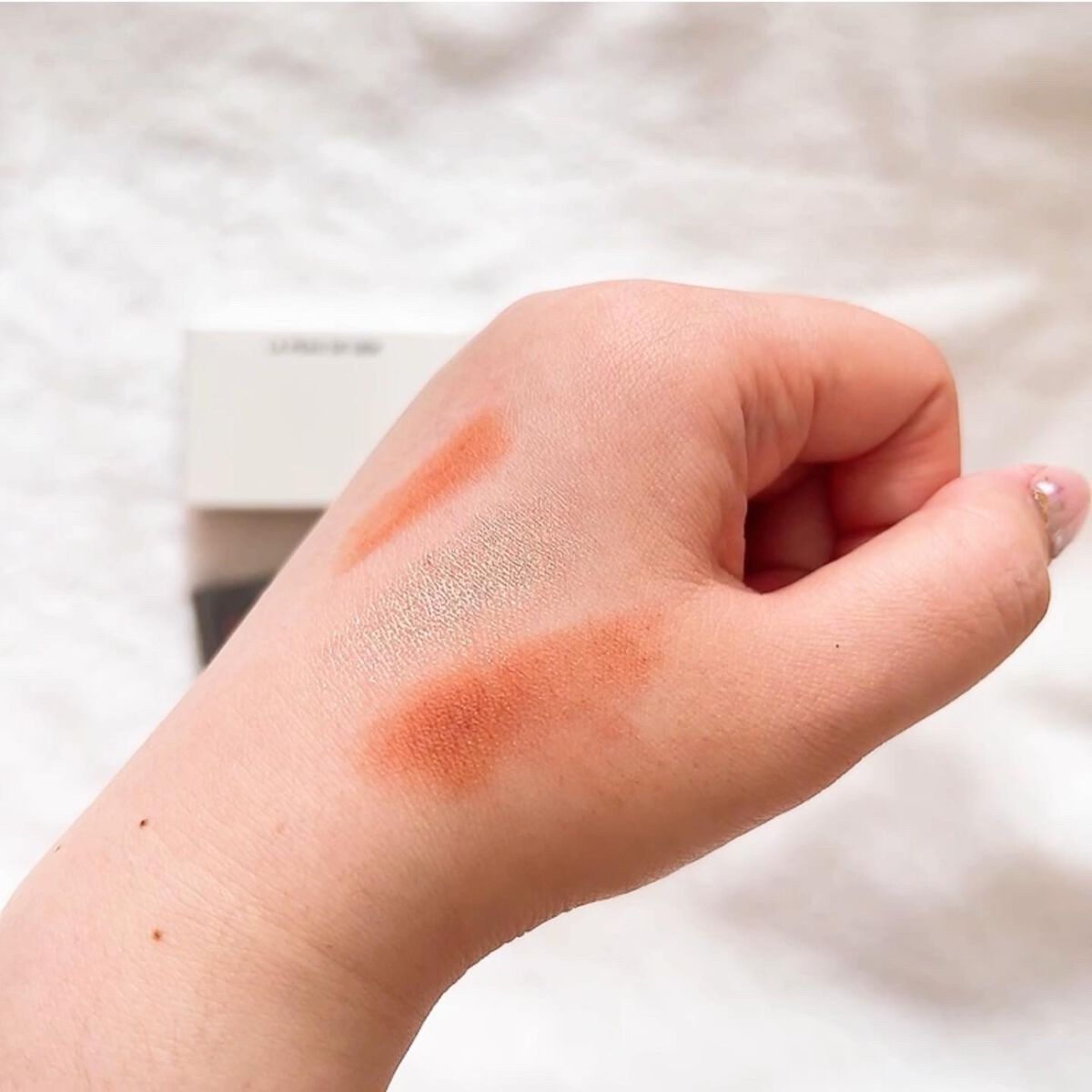 la peau de gem.がなんだかとっても盛れました🧡 色名のピンクは正直感じないけど笑 とっても大人っぽいテラコッタオレンジのマット(ラメ入り)✖︎しっとり微細なゴールドラメが美しい。 よしみちカラコン、シャボン玉カラコンでお馴染みの全人類似合うグレーカラコンは付け心地も抜群で大人カジュアルにもぴったり。