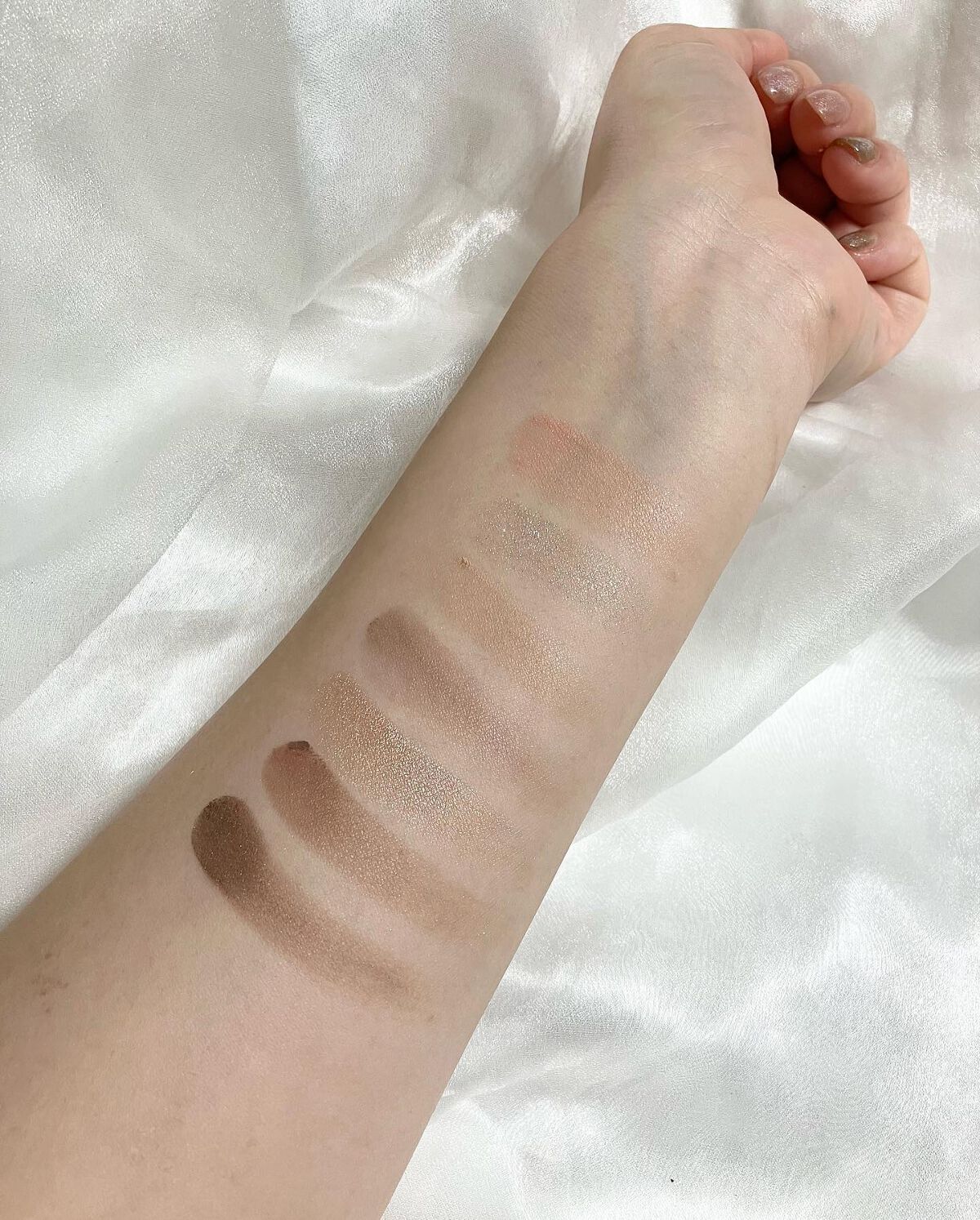 粒子の細かい、ふわっと軽い質感だけど、しっかり密着してくれます。 ぼかしやすく、カラー構成ももグラデーションしやすくなってるから、 ぼかすのが苦手な方には良さそう🎶 ほのかなパール、マットの組み合わせでナチュラルなグラデーションアイの出来上がり🥰