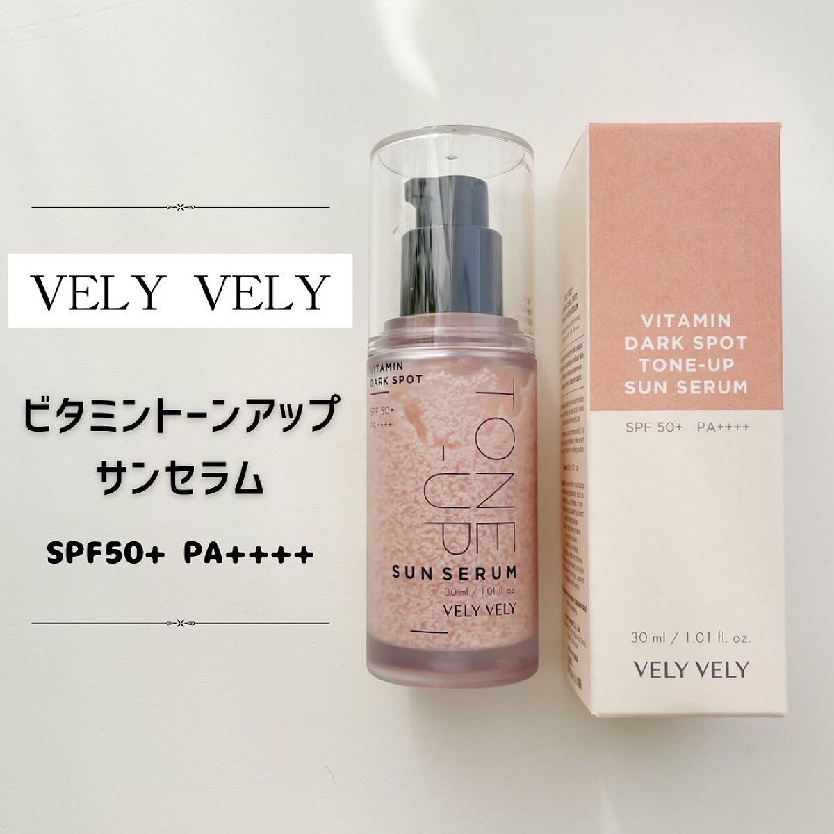 ☑VELYVELYビタミントーンアップサンセラム使って驚き!!めちゃくちゃ気に入った!みずみずしいテクスチャから伸ばしなじませるとぴたぁっと密着して艶、トーンアップ!しかも1日中くすみ知らず!!夕方ファンデのくすみが気になる時もこれを下地に仕...