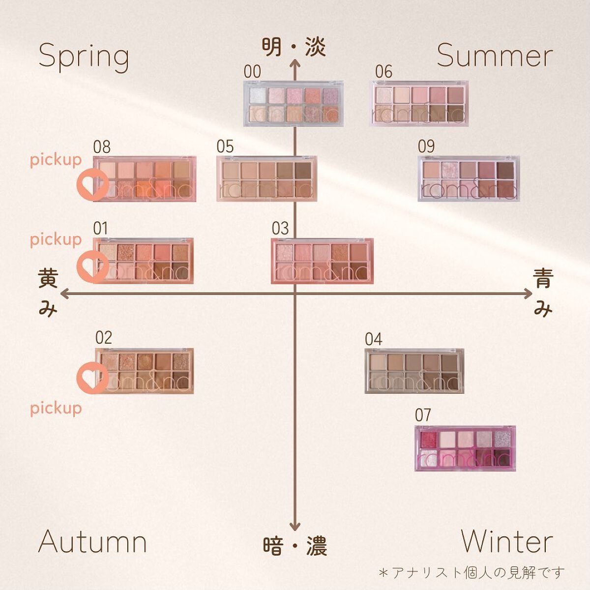 強過ぎないナチュラルな発色でデイリーメイクにぴったり🤍 自分に似合うカラーを見つければ本当に毎日活躍してくれそうです💕 やわらかく可憐なミュートピンク系パレット。ブルベさんにおすすめカラーです💙 落ち着いたやわらかい印象のミュートモーヴ系パレット。ブルベさんにおすすめカラーです💙 明るくあたたかみのあるベージュ系パレット。イエベさんにおすすめカラーです💛 新色04がおすすめ!✨