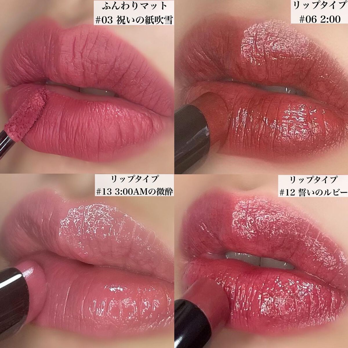 このカラーは深い赤味のあるピンク。 ツヤ感もあってメイクした!って感じになる🥺 ティッシュオフすると色味も落ちるけど、ツヤ感はそのままで落ちても汚くないの。 濃いめのカラーでもムラにもなりづらくするする塗れる✨ 13番はすっぴんでも合わせやすいけど、12はメイクしてないと唇だけ目立つかな。 ナチュラルメイクやすっぴんの時に使いたい人は13。お出かけやお仕事で使いたい人は12がおすすめ。 プチプラでこのクオリティすごいよ… バズリップなだけある。 見つけたら即確保だよ!🤔✨