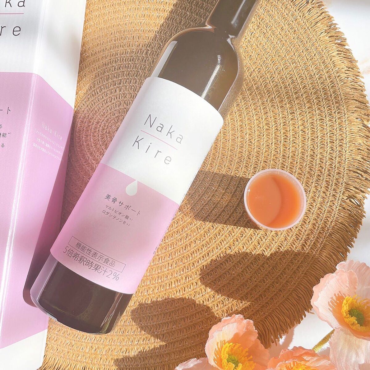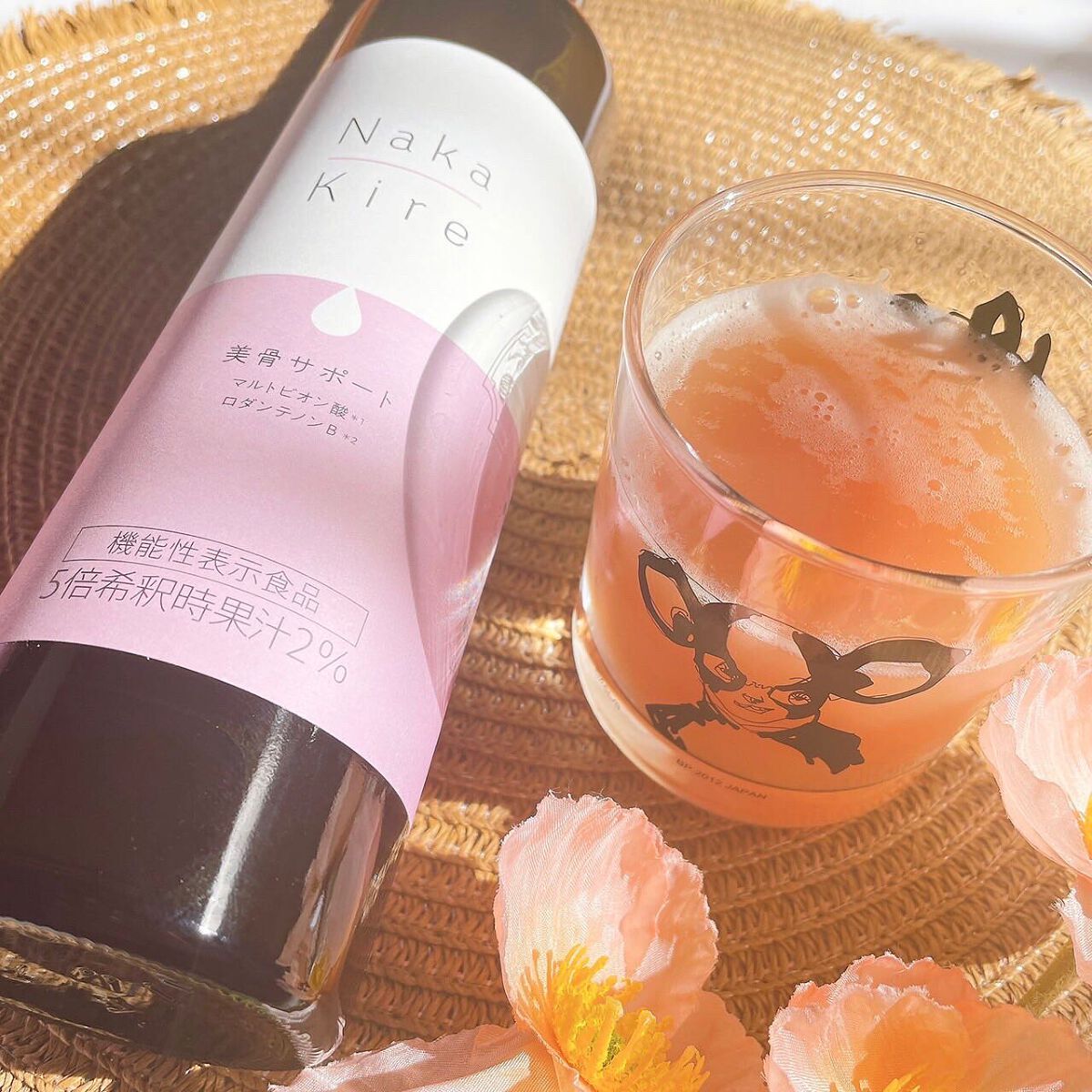 Naka Kireは、お腹の調子を整えるマルトビオン酸(オリゴ糖酸Ca)と、肌のうるおいをキープするロダンテノンB(マンゴスチンエキス末)配合で、からだのNakaから、Kireいをサポートし、糖化ストレスを受けたカラダへアプローチする美容ドリンクです。 そのほか、ざくろ果汁、エクオール酸生産乳酸菌、イソフラボン、海洋ミネラル、マリンコラーゲン、ヒアルロン酸といった女性に嬉しい成分ばかり😃 ワインボトルのようで、見た目もおしゃれですよね〜👏🏽👏🏽 希釈タイプなので、アレンジが豊富なのもポイント!今回は、炭酸水で割ってみました。メモリがついている容器が入っているので、目安がわかりやすいです。ヨーグルトやアイスクリームにかけるのもいいですね😉 テイストは薄めで、フルーティな感じです。とにかく飲みやすいです。お肌も骨もと考えると、いろいろとらなければいけないですが、これがあれば1本で両方ケアできるのは嬉しいですよね🥹