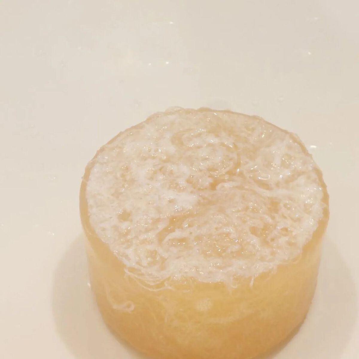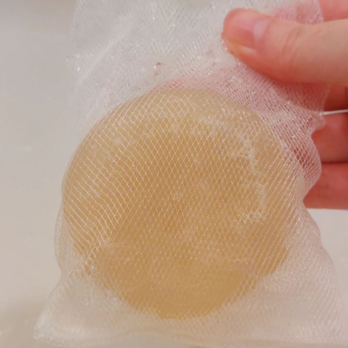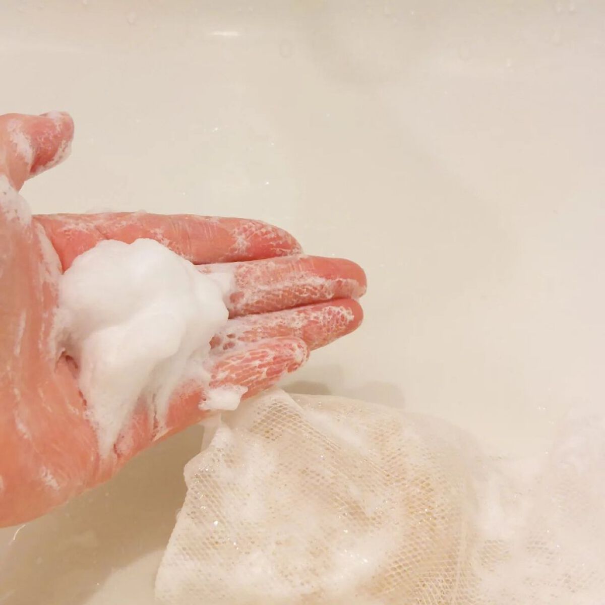 ものすごく独特で、織物の製造過程から発生する高保湿成分を含んだ天然シルクの束を固形石鹸に閉じ込めています。 濃密な泡と柔らかい絹糸で肌をマッサージすることにより、ゴワゴワの肌もツヤツヤになるそうです。 濱縮緬マッサージングソープは、実はきぬいとが現れた面でお肌をマッサージしながら、直接洗うのをメーカーさんではオススメされています。 肌が敏感な片やニキビの片は、泡立てネットを使ってモコモコ泡を作ってから優しく洗いましょう! 泡立てネットで泡立てると、濃厚なモコモコ泡が出来上がり! 洗いあがりは、突っ張らないけど、サッパリと洗い上がる使用感です。 濱縮緬マッサージングソープは男女兼用で使えちゃいます。