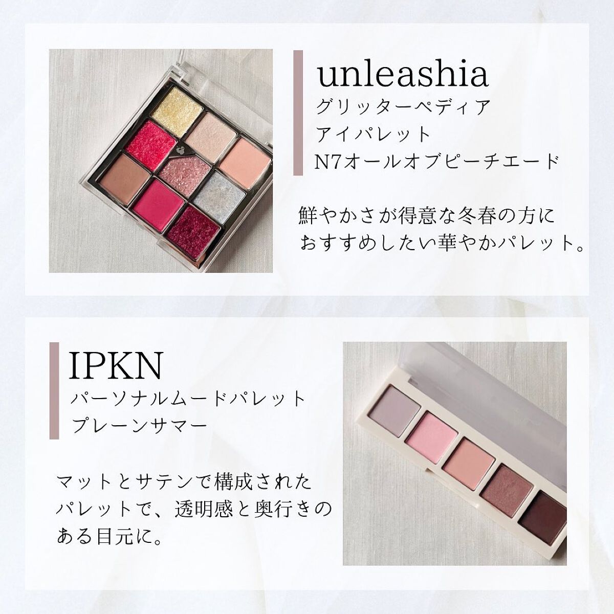 発売からちょっとお時間経ってしまいましたが😇 春の日差しのようなぬくもりを感じるパレット さまざまなピンクアイメイクを楽しめるパレット 発色はそれほど強くないので、最近韓国メイクでトレンドの色みを控えめにしたメイクにも良さそうです◎ 私の場合(ブルーベースウィンター)は発色と敏感肌保護のためアイシャドウベース仕込んで使用します🤔