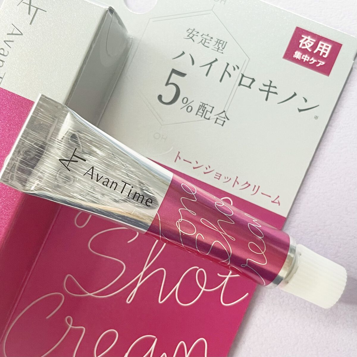 - 「アバンタイム トーンショットクリーム」は安定型ハイドロキノン SHQ-1を5%配合したクリームです。成分が徐々に溶け出しターゲットエリアにアプローチする製品設計であるため、肌にやさしく持続的な作用が期待できます。滑らかで密着しやすいクリームタイプなので、気になる部分を集中的にピンポイントケアすることが可能です。夜のスキンケアの最後に、お肌の気になるポイントにご使用ください。