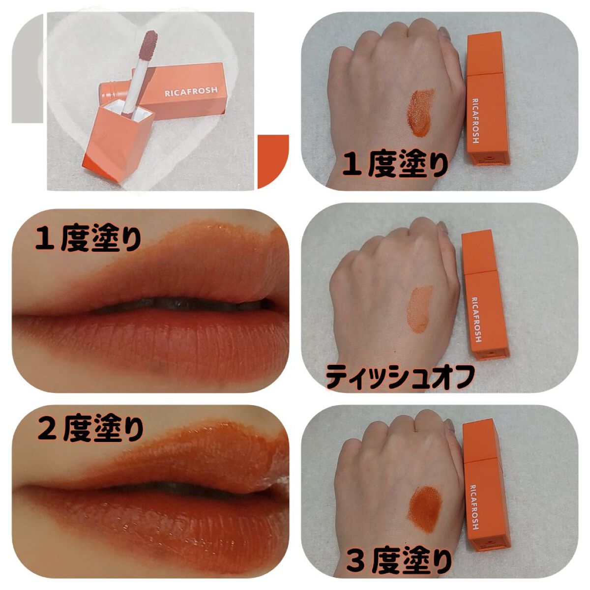 RICAFROSHジューシーリブティント01オランジェット07ビワマイト12スコーチドーナツ各¥1,848・リカフロッシュの手持ちのオレンジ系のリップを比べてみました🍊・01オランジェットは使いやすいオレンジカラーで3色塗り比べてみるとやや赤...
