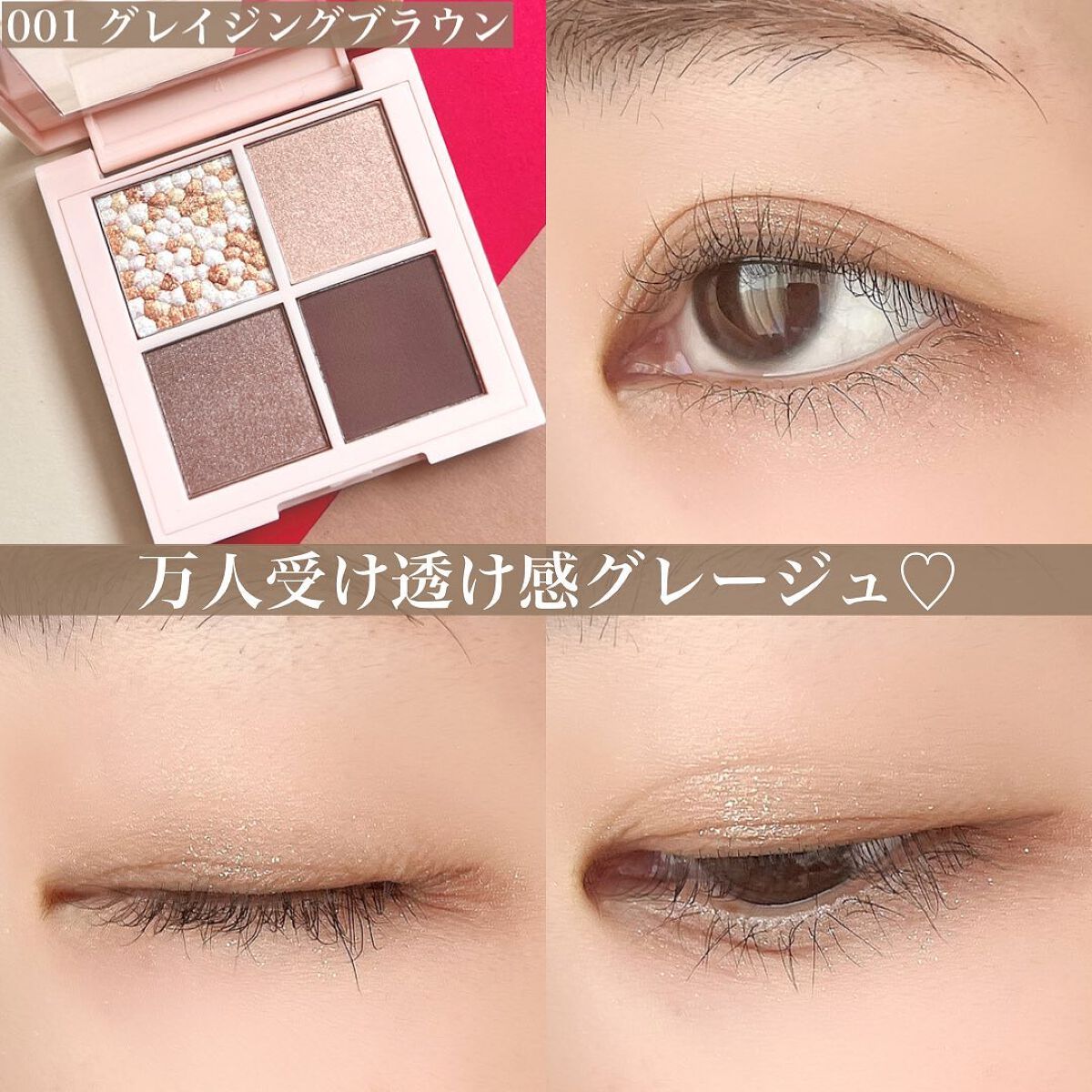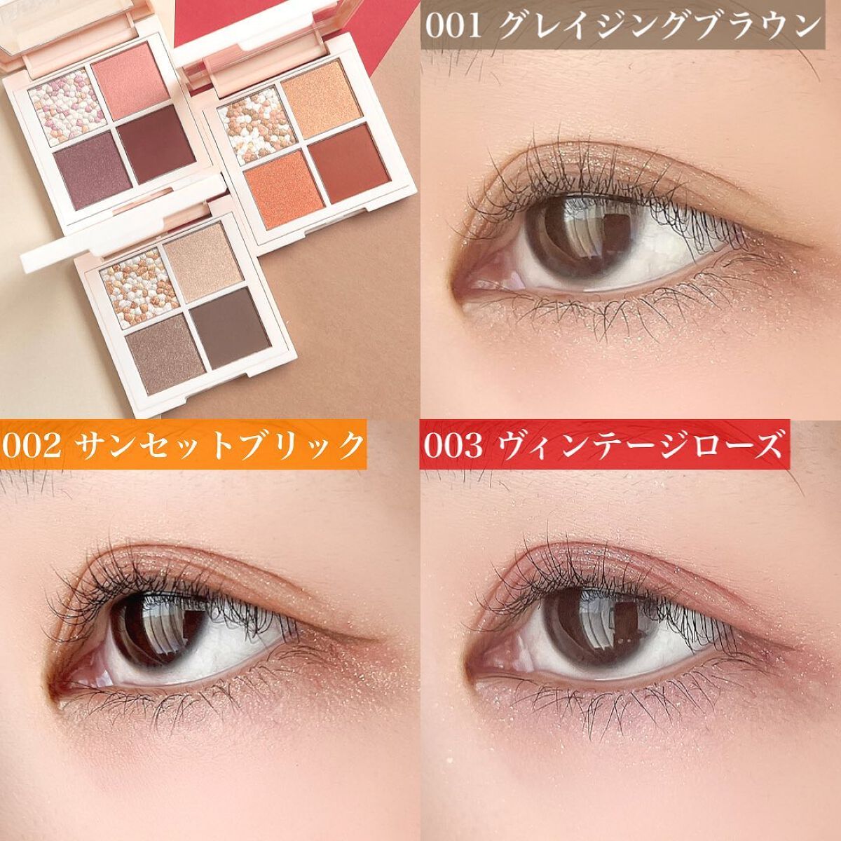 - 透け感カラーに、キラめきレイヤードをプラス #質感ミックス アイシャドウ 1. 4つの異なる質感をミックス マット・サテン・パール・グリッター、4つの質感が楽しめるマルチパレット 2.透け感そのまま!キラめきのレイヤード 重ねても、キレイにキラめく透け感カラーで、澄んだ奥行きのある目元に 3.ふわっとエアリー、なのに高密着 キメの細かな微粒子パウダーがふわっとフィット。軽いのに、しっかり密着 ■001 グレイジング ブラウン 肌にとけ込むシックなグラデ ニュアンス ベージュ ■002 サンセット ブリック マットとキラメキで旬顔! スモーキー テラコッタ ■003 ヴィンテージ ローズ 甘さおさえめでオトナっぽい ボルドー ピンク ■004 ロージー ブラウン 上品に盛れる! ローズ ブラウン ■005 ダスティ モーヴ 繊細なニュアンスを秘めた グレージュモーブ ■006 サファリ シマー 印象深いまなざしの カーキグリーン ■007 ジュエル ムーン ほんのり甘めのキラめき プラムピンク ■008 カシミア ヌード 上質なカシミアを纏ったような ウォームベージュ ■013 ローズ ラスター クールなまなざし グレイッシュローズ ■015 コズミック スター 幻想的な煌めき ブロンズピンク