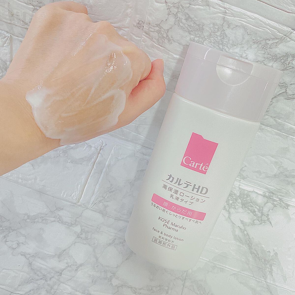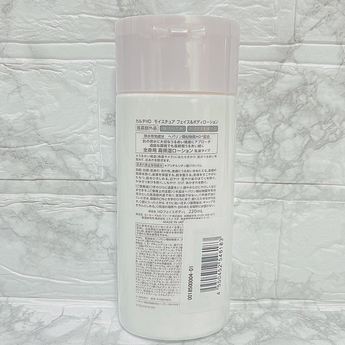 - 【高保湿フェイス&ボディローション】 顔にもからだにも。しっとりやわらか肌つづく。 信頼の保水有効成分「ヘパリン類似物質HD※」配合、低刺激処方の高機能フェイス&ボディローションです。 ヘパリン類似物質HDが、気温・湿度の変化で乾燥しやすいからだの肌のうるおい構造(角層ラメラ)を立て直し、しっとりやわらか肌に導きます。 2種のこだわりオイル配合で、しっとりするのにべたつかず、なめらかにのびひろがる使用感。敏感な肌でもまさつによるストレスがなく、全身をうるおいで満たします。 カルテHDシリーズとしては初めてお子さま(3歳以上)にもお使いいただける商品。 ・ボトルタイプ(220mL) ・ポンプタイプ(410mL) ・つめかえ用(370mL)の3種でラインアップ。 ご自身の保湿に、ご家族や大切なかたの保湿に。みずみずしくなめらかなうるおいが全身を包み込むフェイス&ボディローションです。 ※保水有効成分ヘパリン類似物質のこと <販売名:HD フェイスボディL>