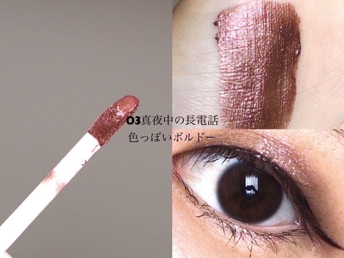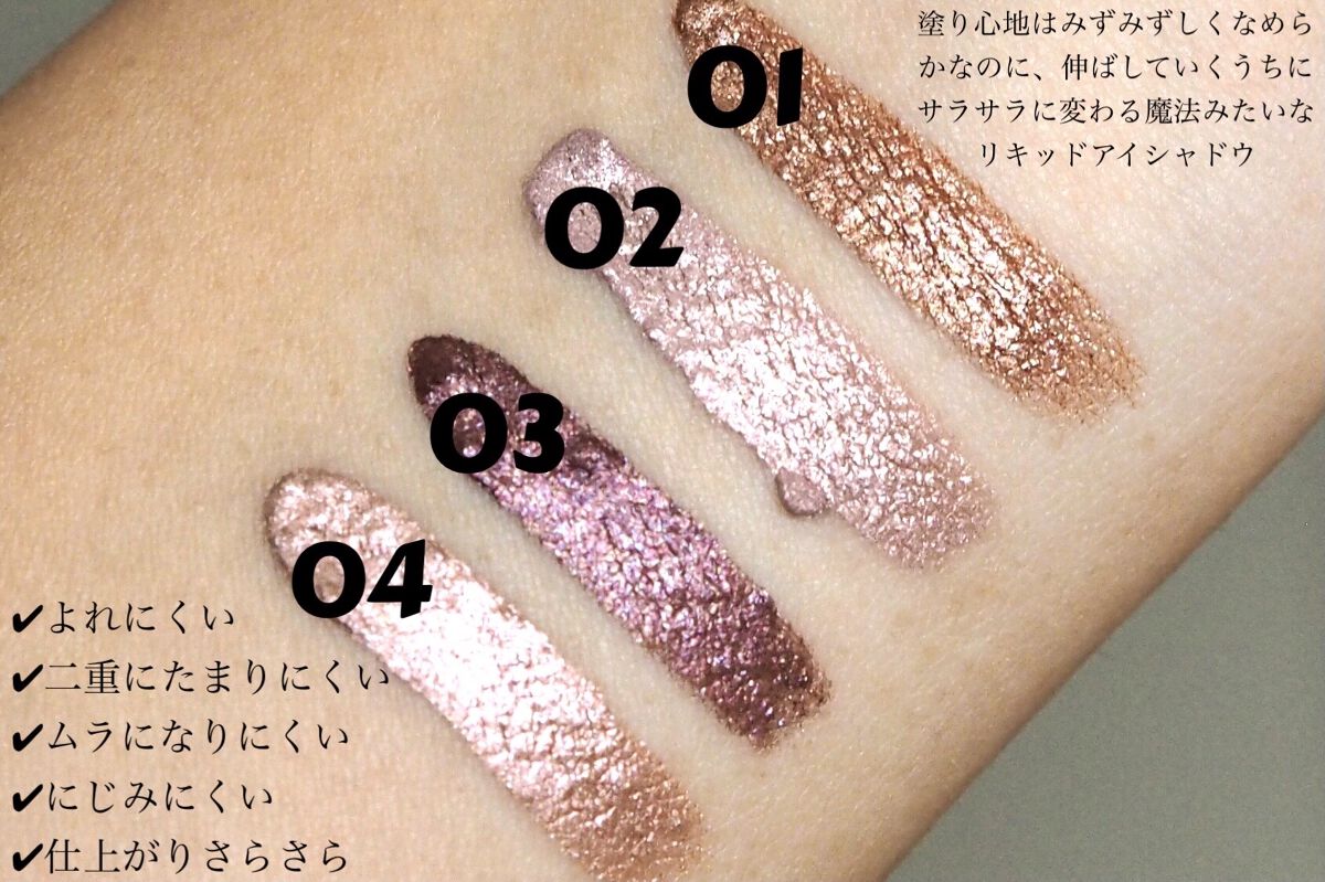 - リッチな輝きが長時間続く サラサラ仕上げのリキッドアイシャドウ 塗り心地はみずみずしくなめらかなのに、伸ばしていくうちにサラサラに変わる 魔法みたいなリキッドアイシャドウ♡ 速乾だからヨレにくく、ふたえのラインにたまりにくい! リキッドアイシャドウならではの輝きが長時間続きます。