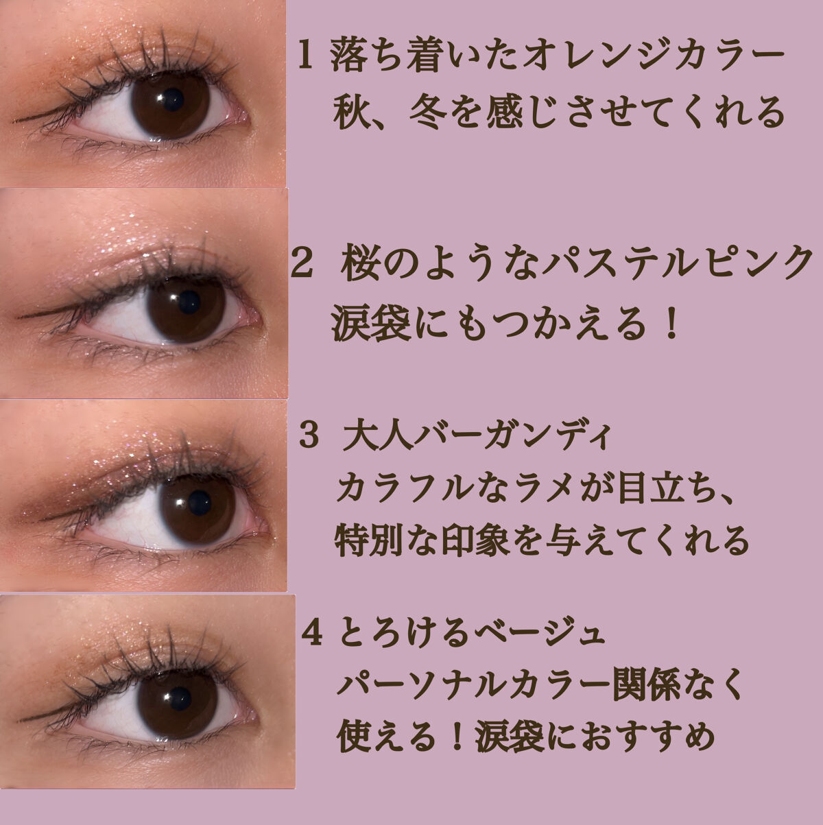 良いところ👍・季節関係なく、いろんな場面で使える・ピンクメイクも、ブラウンメイクも楽しめる・透明感!天使になれる! イマイチなところ👎・1番右下の締め色ブラウンが透け感があるので濃いメイクには向いてないかな。 ブルベだけどブラウンメイクに自信がない💭メイクに透明感がほしい!という方におすすめです!