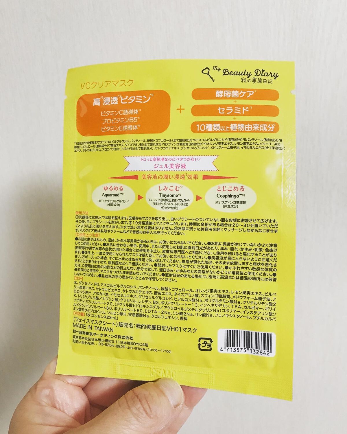 - 我的美麗日記史上最高*1!3種ビタミン×酵母菌に着目したアイテムが新発売! キメの整った輝くツヤ肌に導く、ビタミンC誘導体、プロビタミンB5、ビタミンE誘導体と、美肌酵母菌を配合。 セラミドや10種類以上植物由来成分で、肌のすみずみまでうるおいで満たして、ベタつかないのにお肌にすばやくしっかりとうるおい浸透*2へ。 *1当社比 *2角質層まで 使い方 事前に洗顔後に化粧水でお肌を整えます。 1、袋からマスクを取り出しお顔全体に広げる。白いプラシートははがす。 2、10分経過後にマスクをはがす。 *時間に余裕がある場合は20~30分置いていただくとよりお肌に潤いを与えます。 3、お顔に美容液が残っている時は、指先で軽くマッサージしながらなじませる。 ※水で洗い流す必要はありません。 マスクケア後は乳液やクリームなどで普段のお手入れを行ってください。