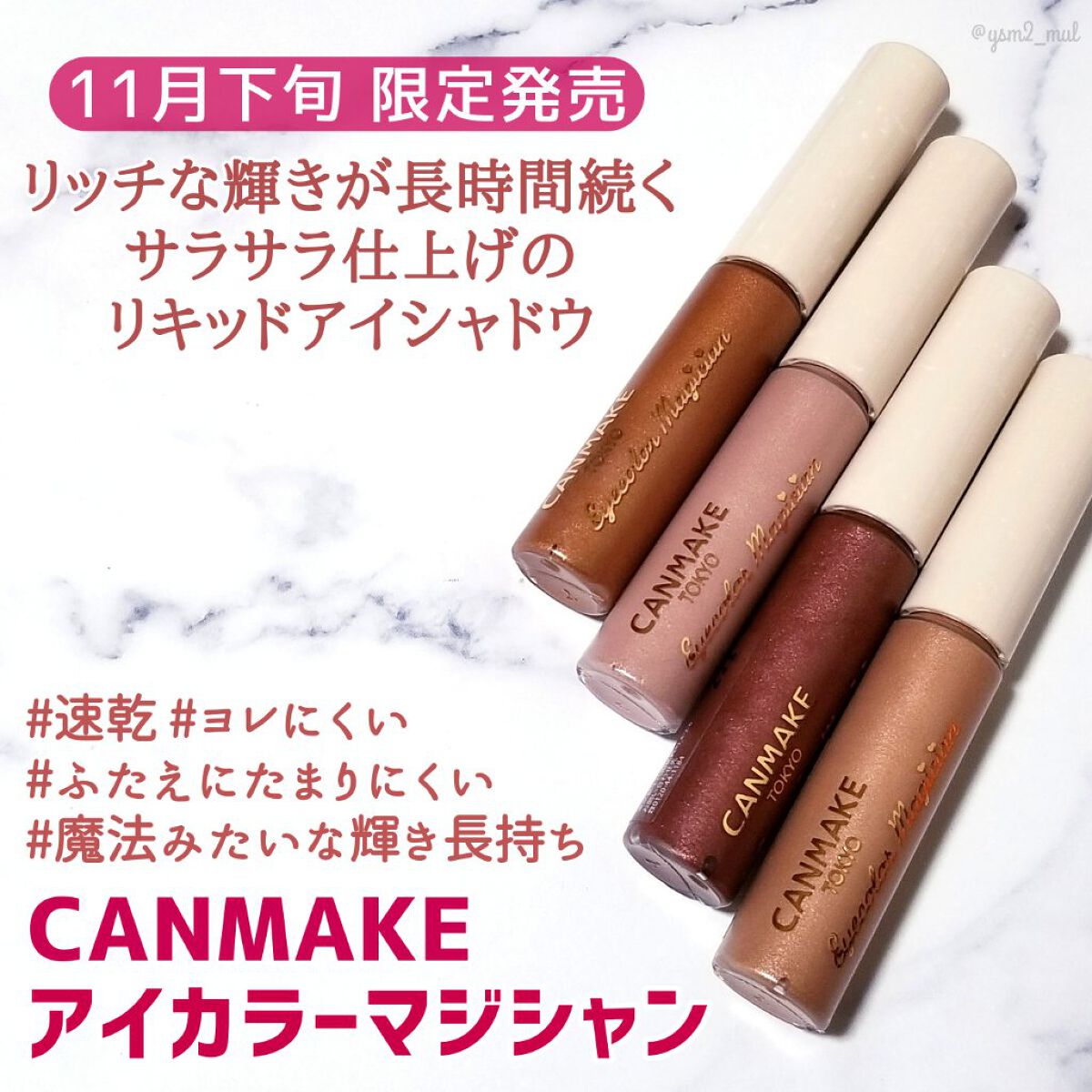 キャンメイクアイカラーマジシャン リキッドアイシャドウです。 乾燥が早く、グラデーションにする際は手早くのばす必要がありますが、乾くとピッタリと密着してラメも飛びにくく使いやすいアイシャドウ。これ一本でもいい感じになるのでお気に入りです。 マ...