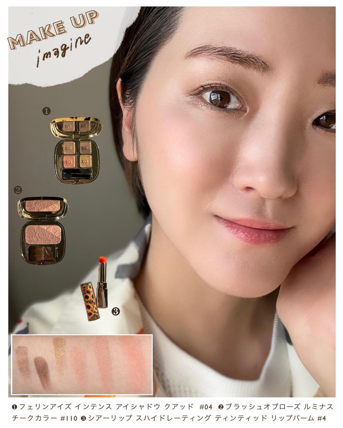 アンプリのベーシック系のカラーの中でもひときわニュートラルな、色味を削いだようなベージュブラウン。 こちらも少し前(7/30)にレビューしているのでそちらもご参考いただけたら🙇♀️ このパレットはベーシックでありながらトレンド感もあるところがお気に入りポイントでして、ちょっとセピアを帯びたようなくすみ感がなんとも言えずお洒落な雰囲気を醸し出してくれます。 というのは全体的に肌に馴染むようなヌーディカラーで構成されたすごくナチュラルなシェードなんだけど、シルバー系のパールが潜んでいたり、少しくすみ感があったりと、甘さを取り除いてクールな仕上がりになるところがめちゃくちゃかっこいいのよ。 ダイヤモンドを彷彿とさせるような大粒のラメの煌めきがたまらなく美しいアイカラーです。 このパレットの好きなところは、マットが主役なところ。絶妙にニュアンスの異なる3色のマットでグラデーションしやすいのがミソです。 パールカラーの入れ方次第で表情が変わるパレットだと思う。