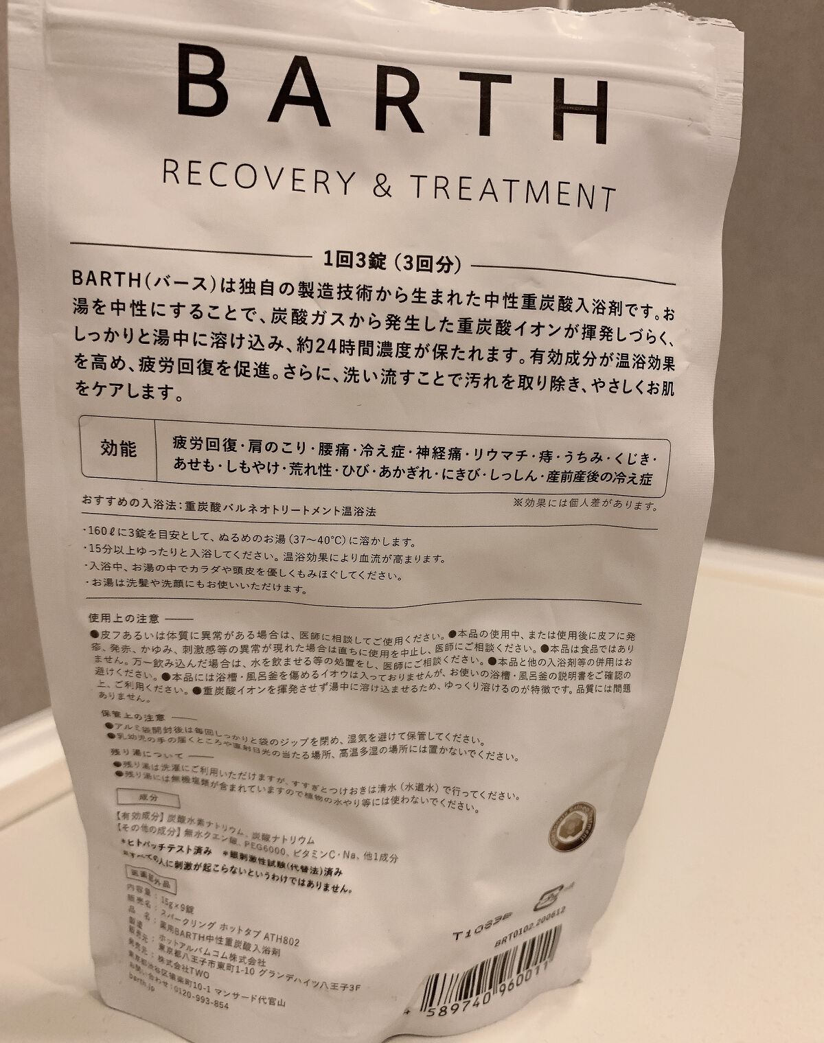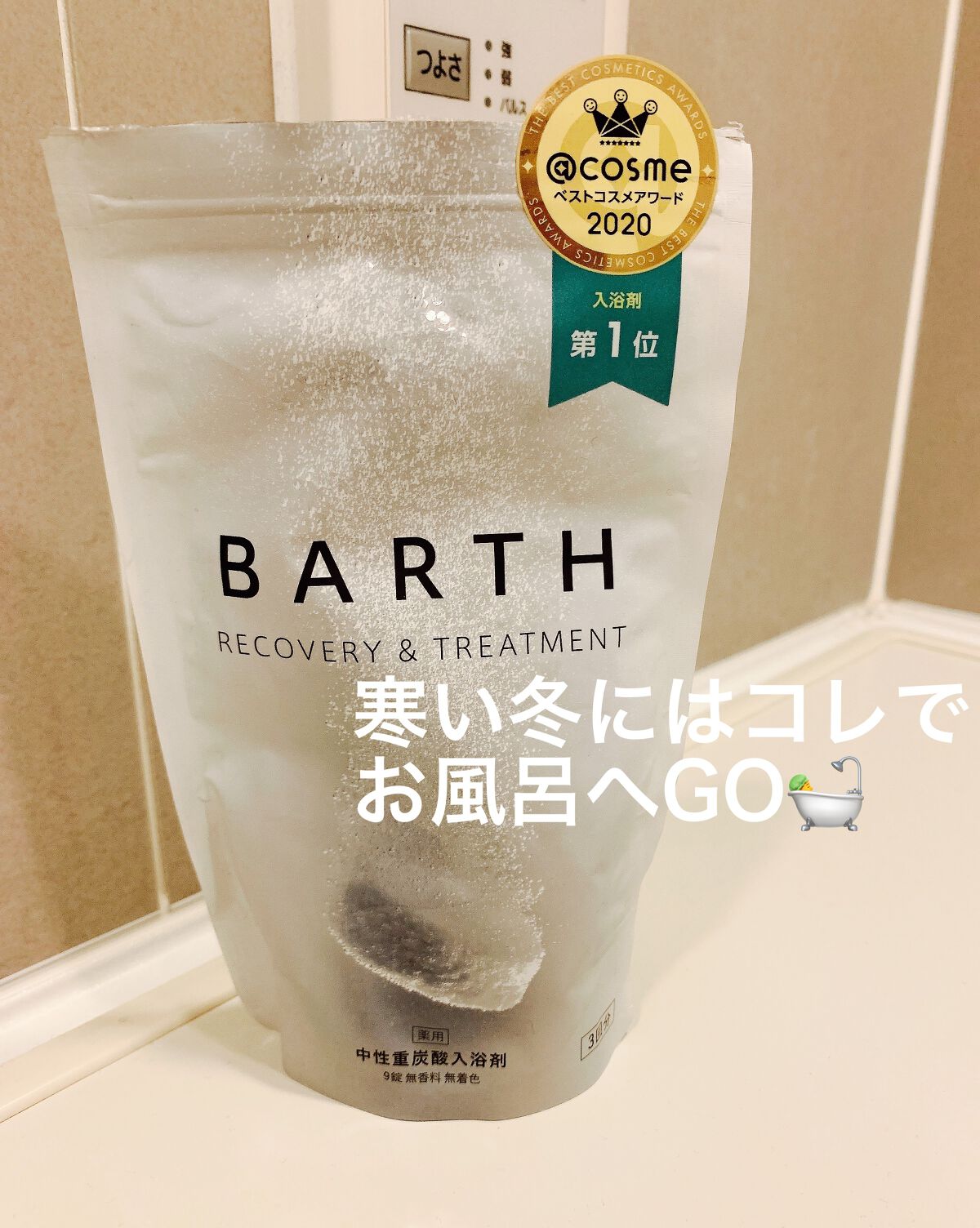 SNSで話題になっていたbarthの薬用BARTH中性重炭酸入浴剤です🤍 疲労回復や肩のこり、腰痛や冷え性などに効くと聞いて購入しました🫶 湯船に入れると柔らかいお湯になり、肌がツルツルして温泉みたい~♨ お風呂から出たあともじわじわポカポカしてして温まる感じがしました🐵 値段は1回300円と安くは無いお値段ですが、実際に使ってみると翌朝疲労感が軽減されて、手先の冷えも改善されたように感じたのでぜひ使ってみてください🐨