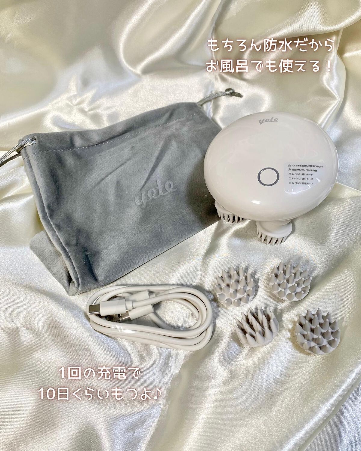 - yeteヘッドスパ 電動頭皮ブラシ プロのマッサージ手法を再現 自宅で心地良いヘッドスパを楽しめます。 まるでお店のプロなマッサージ師のような揉み心地 頭皮と肩をマッサージして、1日の終わりのリラックスタイムに。 ※3種類のマッサージモードボタンを押すことで切り替えます ※IPX7防水防塵に対応と赤色LED ※硬さのちょうどいい2種類のマッサージブラシ ※一回の満充電で約10日間使用可能