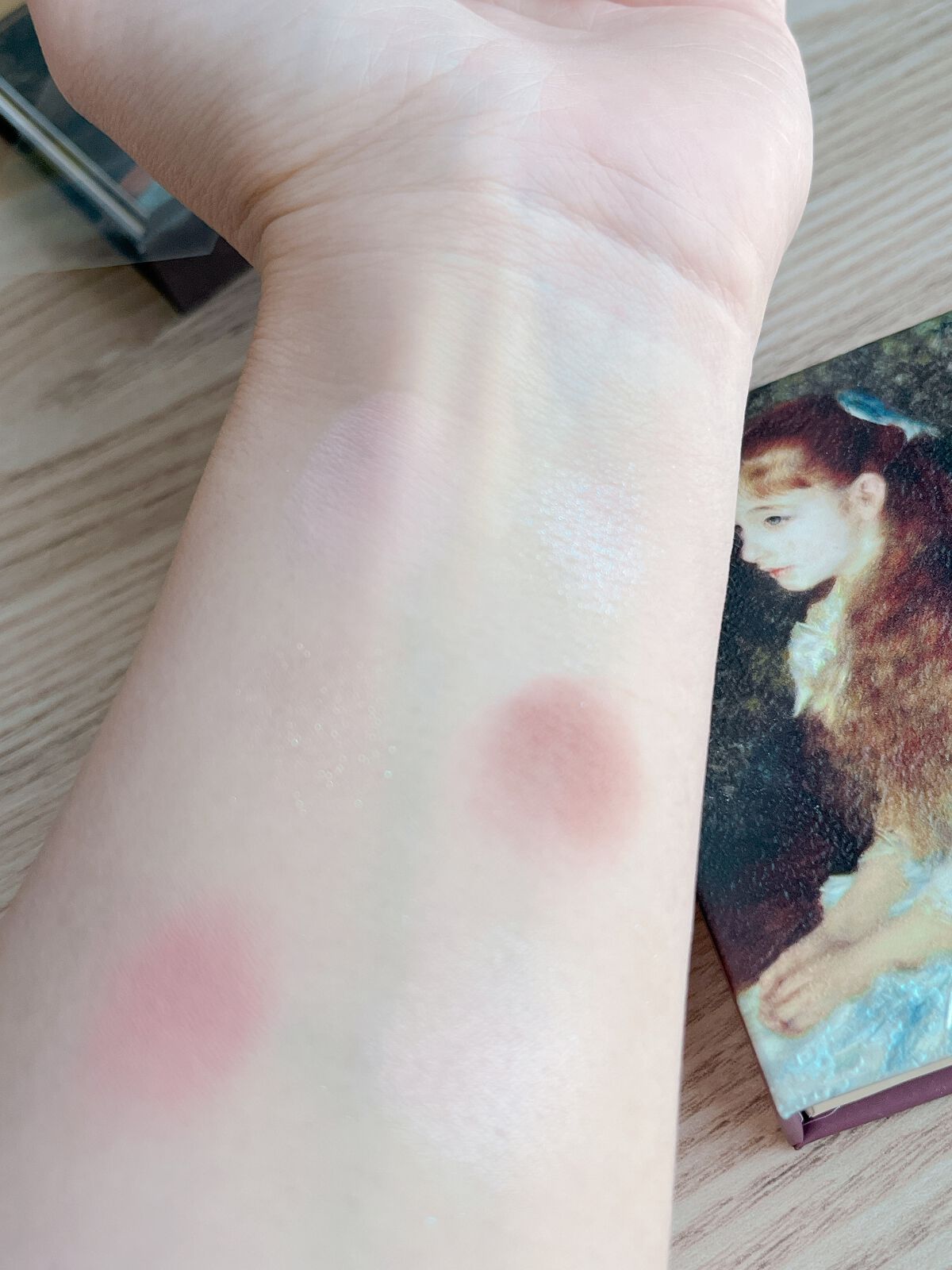大好きな画家 ルノワールの絵画がアイシャドウに!油絵っぽい質感のデザインになっていて、本当に可愛いです。 しっとりしたテクスチャーのアイシャドウで、目元にぴたっと密着してくれます。ピンクベースの優しい色味。 淡いピンクベースのアイシャドウパレット。パープルのラメはひと塗りするだけで儚い瞳に。