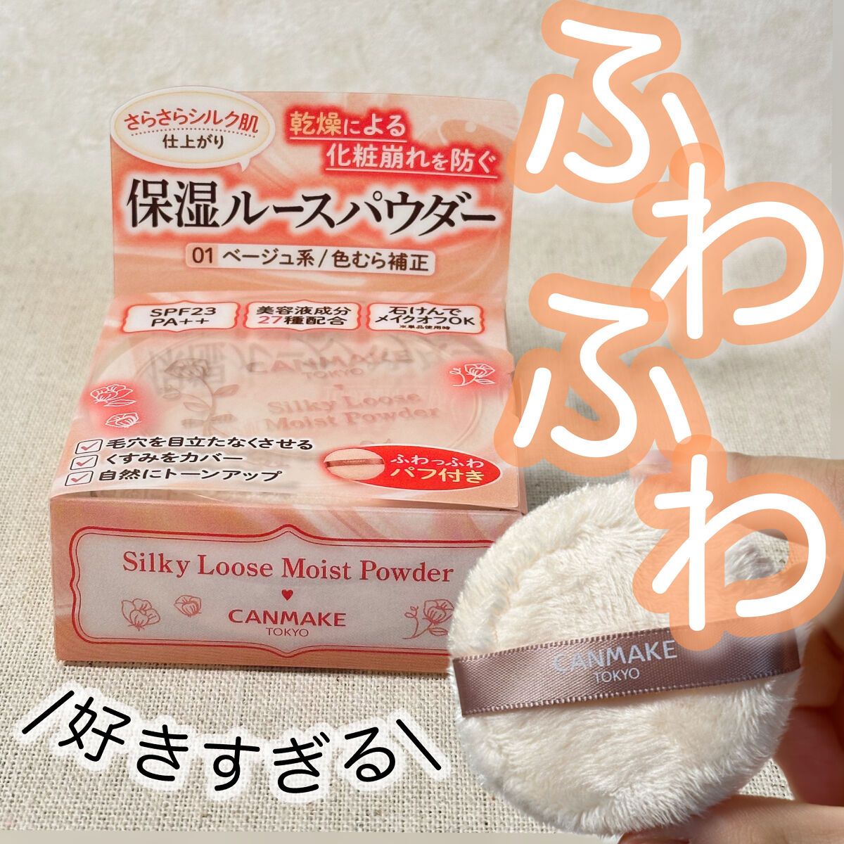 - 素肌キレイ見え!シルク肌仕上がり! 乾燥による化粧崩れを防ぐ、保湿ルースパウダー 石けんでオフOK(単品使用時)、SPF23・PA++、 27種の美容液成分配合(うち3種は、お肌引き締め成分)の 保湿タイプのルースパウダー。 塗った瞬間、まるでシルクのヴェールをまとったようなサラサラのお肌に…♡
