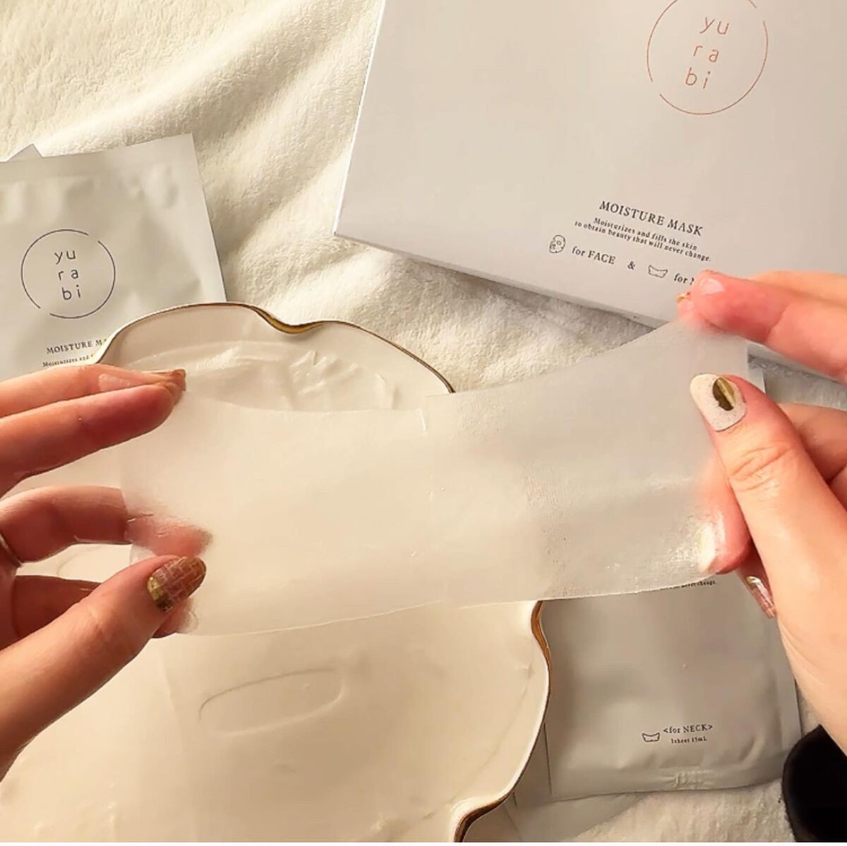 美容成分をたっぷりしみこませたフェイス&ネックマスク。 肌のくすみや、ごわつき・ハリ不足が気になる大人の肌にたっぷりとしみこませた美容成分が、肌のすみずみまで届き、ハリのある艶めく肌へと導きます。 とろとろと糸をひく、たっぷりの美容液! 柔らかいシートが、肌にピタッとはりつきます! ネックマスクって初めて!首もとのたるみをカバーしてくれるよ。 どちらも美容液がたっぷりなので、めちゃくちゃハンドプレスしました(笑)もちもち肌に!