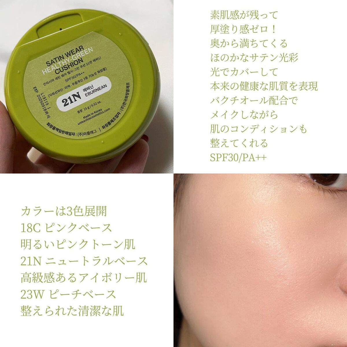 韓国でも日本でもバズっているベースメイクコスメ。 ヴィーガンコスメのunleashiaから9月に発売されたばかりのヴィーガンクッションファンデーション新登場! 肌に輝きを与え、自然なサテン仕上げを施したヴィーガンクッションファンデーション ✓次世代レチノールとして注目 バクチオール配合! 高密着ファンデでマスクに付きにくくて崩れにくいのにテカらず保湿力もあって感動しました✨これから乾燥する季節にもぴったりなアイテム!