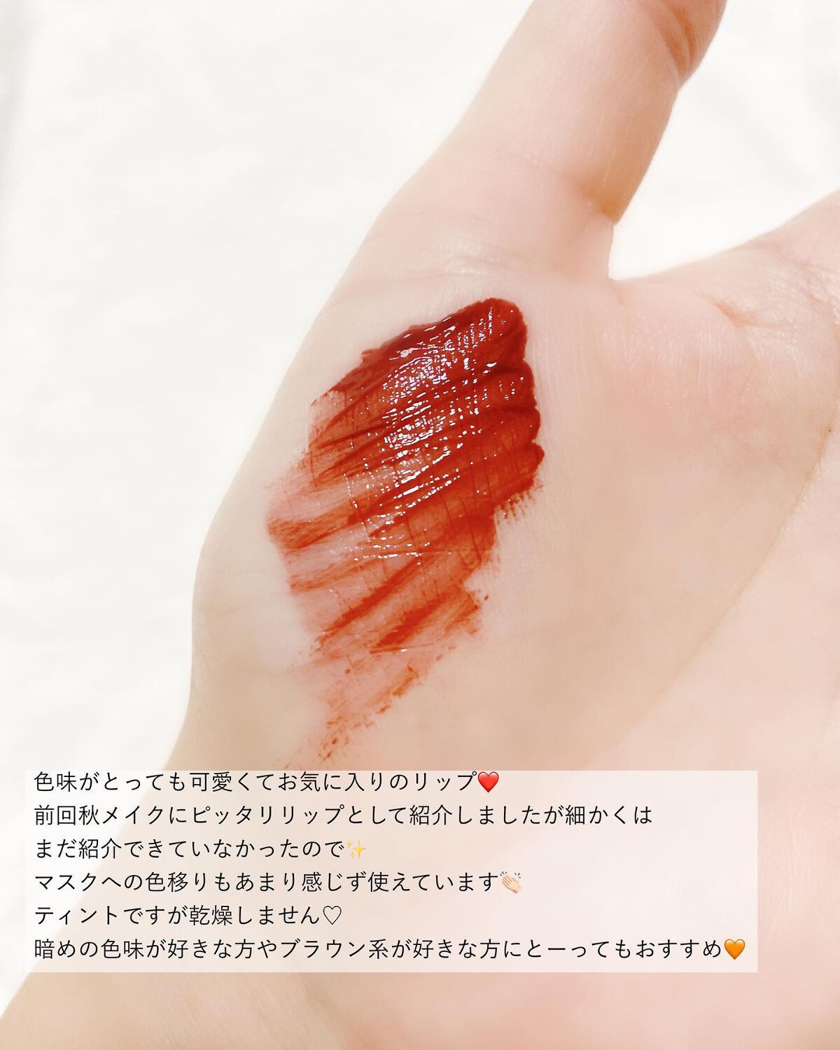 🤎RICAFROSHジューシーリブティント08 レイシ―ビスケ🤎こってりめのテクスチャーで発色がよく、見たままのカラーに発色します😊色持ちもよく、飲食しても落ちにくく、夜までほんのりと色が残っていました✌🏻✨甘すぎない大人なピンクベージュで肌...