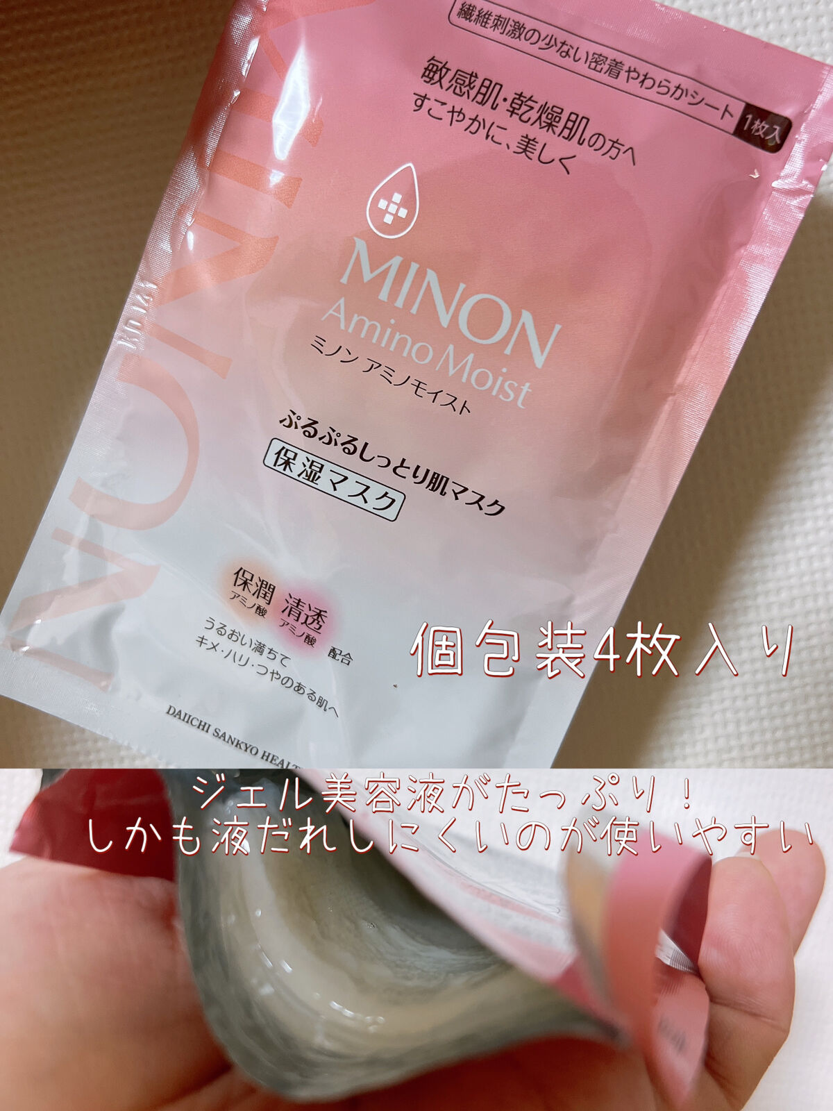 - 思わず触れたくなるほどみずみずしい肌へ。うるおって透明感。 乾燥による小ジワを目立たなくします(効能評価試験済み) 水分を保つ機能が低下しがちな角質層に、バリア機能をサポートする保湿成分を補給 ぷるぷるジェルがしみこんだ密着やわらかシートで、液ダレしません ◎ミノン アミノモイストのシートマスクは化粧水で肌を整えた後にお使いいただく「美容液マスク」です。 週に1-2回のスペシャルケアとしておすすめです♪