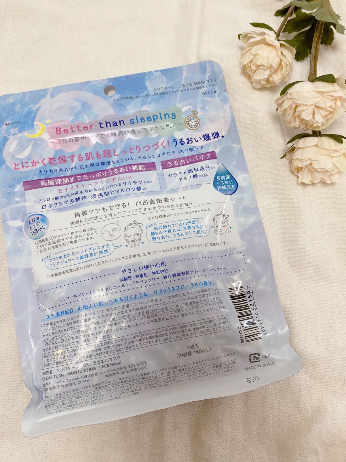 ♡クリアターンうるうるBOMB7枚入心地よい眠りへみちびくようなリラックスフローラルの香り。oOo。.:♥:.。oOo。.:♥:.。oOo。.:♥うるうるBOMB初めて使用してみました!香りもよくパックも広げやすく付けやすい☺️8分程度おくだ...