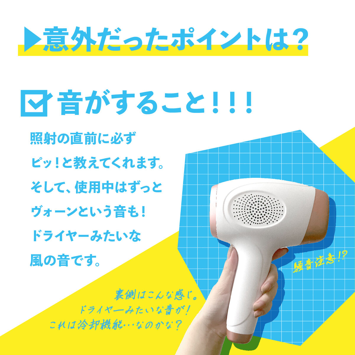 初回使用レビューなので、痛み&照射時間について画像にまとめています。照射レベルMAXでも痛みは全然余裕◎ 意外だったのは、音!掃除機ほどうるさくはないけど、ドライヤーの微風モードくらいの音がします。 とはいえコスパは良し:)スキンケアモードもあるのでもし脱毛効果が微妙でも、光美顔器として活用していきます✦