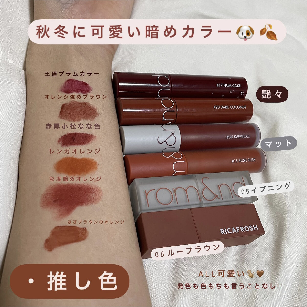 ロムアンドの赤系リップ!①rom&ndジューシーラスティングティント20ダークココナッツ②rom&ndジューシーラスティングティント17プラムコーク③rom&ndゼロベルベットティント21ヴィランベスト④rom&ndゼロマットリップスティック...