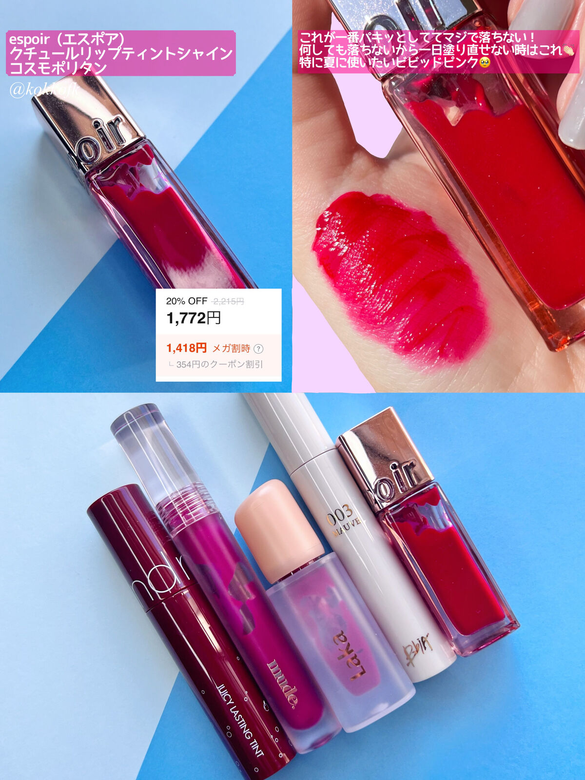 | リップティントランキング第73位 | なめらかな塗り心地で色鮮やかで透明感のあるカラー😊みずみずしさ、プルン感がとにかく可愛い💕 | 詳細を見る | |
