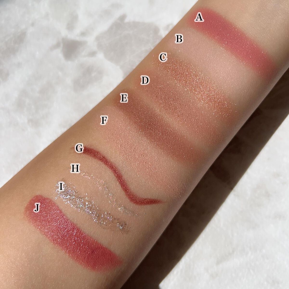 今回の新色は"まぶたに濡れたような光沢を放つ艶、光を操る立体感をプラスしリュクスなまなざしを叶えてくれる"というプリズムフォーミュラ。 確かにいつもとはちょっと違う…良いですこれ🫶❤️ ヌメッと面で光るようなツヤ感✨ テクスチャーは刻印ありタイプ、ツヤはクリームタイプに近いと思います🥰 要は刻印ありとクリームの良いとこ取りですね! ゴールドと柔らかいレッドの組み合わせ。アプレスキーとエレクトリックチェリーの中間のような色合い🤔 ゴールドとピーチカラー。今回の3色の中では一番黄みが強い。 青みがかったローズが可愛い。ぱっと見はわからないけど左上にみんな大好き青ラメが…!!