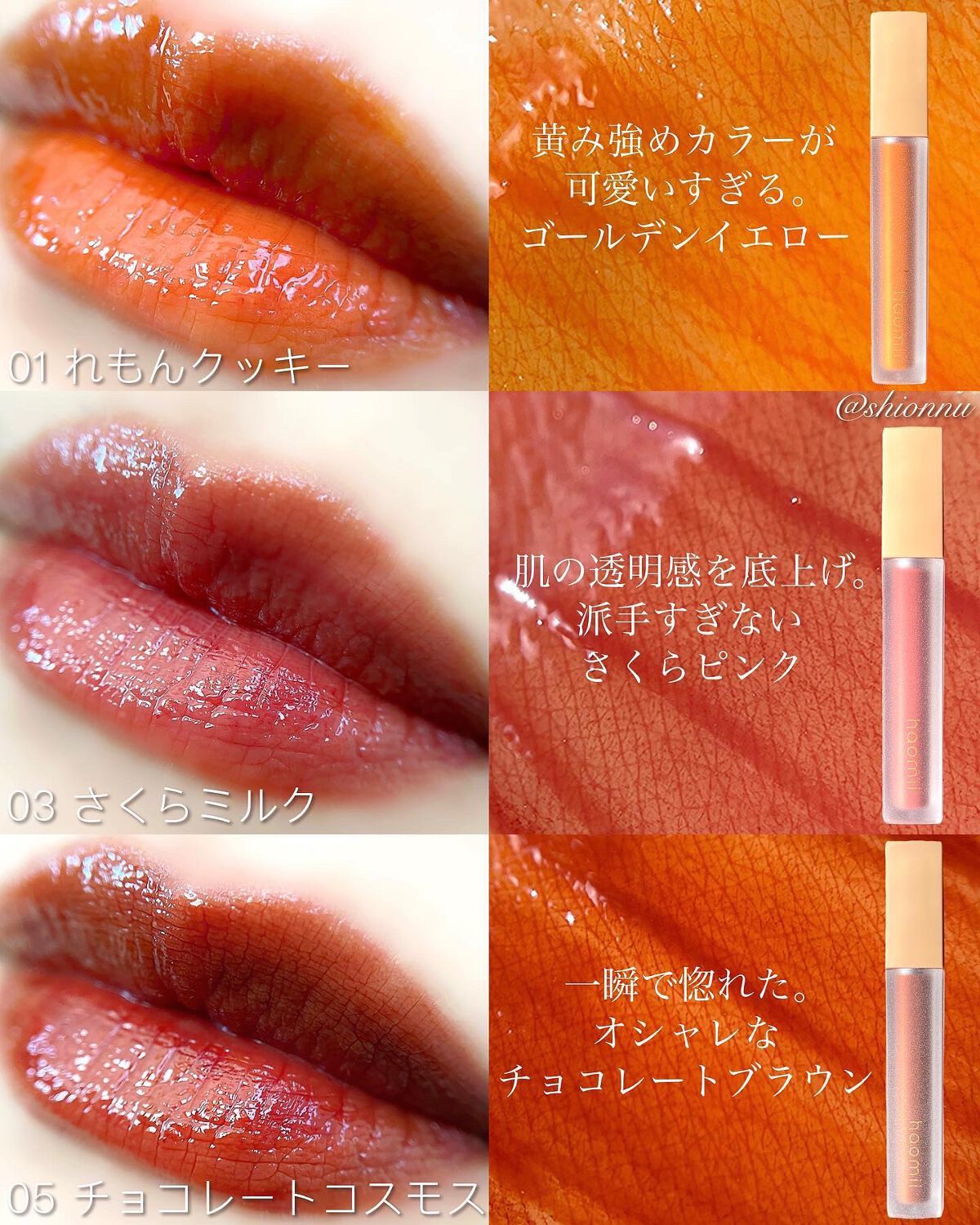 - <01 れもんクッキー> ジフェニルジメチコン、水、リンゴ酸ジイソステアリル、ビスジグリセリルポリアシルアジペート-2、オクチルドデカノール、水添ポリイソブテン、ダイマージリノール酸ダイマージリノレイルビス(ベヘニル/イソステアリル/フィトステリル)、ジグリセリン、DPG、セチルPEG/PPG-10/1ジメチコン、イソステアリン酸ソルビタン、ポリソルベート60、スクワラン、アーモンド油、オリーブ果実油、アルガニアスピノサ核油、カニナバラ果実エキス、トリ(カプリル酸/カプリン酸)グリセリル、グリセリン、ステビオシド、(アクリル酸ヒドロキシエチル/アクリロイルジメチルタウリンNa)コポリマー、ポリグリセリン-3、ペンチレングリコール、エチルヘキシルグリセリン、セテアレス-20、テトラ(ジ-t-ブチルヒドロキシヒドロケイヒ酸)ペンタエリスリチル、フェノキシエタノール、香料、酸化チタン、酸化鉄、赤227、黄4、黄5 <02 あんずバター> ジフェニルジメチコン、水、リンゴ酸ジイソステアリル、ビスジグリセリルポリアシルアジペート-2、オクチルドデカノール、水添ポリイソブテン、ダイマージリノール酸ダイマージリノレイルビス(ベヘニル/イソステアリル/フィトステリル)、ジグリセリン、DPG、セチルPEG/PPG-10/1ジメチコン、イソステアリン酸ソルビタン、ポリソルベート60、スクワラン、アーモンド油、オリーブ果実油、アルガニアスピノサ核油、カニナバラ果実エキス、トリ(カプリル酸/カプリン酸)グリセリル、グリセリン、ステビオシド、(アクリル酸ヒドロキシエチル/アクリロイルジメチルタウリンNa)コポリマー、ポリグリセリン-3、ペンチレングリコール、エチルヘキシルグリセリン、セテアレス-20、テトラ(ジ-t-ブチルヒドロキシヒドロケイヒ酸)ペンタエリスリチル、フェノキシエタノール、香料、酸化チタン、酸化鉄、赤227、黄4、黄5 <03 さくらミルク > ジフェニルジメチコン、水、リンゴ酸ジイソステアリル、ビスジグリセリルポリアシルアジペート-2、オクチルドデカノール、水添ポリイソブテン、ダイマージリノール酸ダイマージリノレイルビス(ベヘニル/イソステアリル/フィトステリル)、ジグリセリン、DPG、セチルPEG/PPG-10/1ジメチコン、イソステアリン酸ソルビタン、ポリソルベート60、スクワラン、アーモンド油、オリーブ果実油、アルガニアスピノサ核油、カニナバラ果実エキス、トリ(カプリル酸/カプリン酸)グリセリル、グリセリン、ステビオシド、(アクリル酸ヒドロキシエチル/アクリロイルジメチルタウリンNa)コポリマー、ポリグリセリン-3、ペンチレングリコール、エチルヘキシルグリセリン、セテアレス-20、テトラ(ジ-t-ブチルヒドロキシヒドロケイヒ酸)ペンタエリスリチル、フェノキシエタノール、香料、酸化チタン、赤227、黄4、青1 <04 コットンスイートピー > ジフェニルジメチコン、水、リンゴ酸ジイソステアリル、ビスジグリセリルポリアシルアジペート-2、オクチルドデカノール、水添ポリイソブテン、ダイマージリノール酸ダイマージリノレイルビス(ベヘニル/イソステアリル/フィトステリル)、ジグリセリン、DPG、セチルPEG/PPG-10/1ジメチコン、イソステアリン酸ソルビタン、ポリソルベート60、スクワラン、アーモンド油、オリーブ果実油、アルガニアスピノサ核油、カニナバラ果実エキス、トリ(カプリル酸/カプリン酸)グリセリル、グリセリン、ステビオシド、(アクリル酸ヒドロキシエチル/アクリロイルジメチルタウリンNa)コポリマー、ポリグリセリン-3、ペンチレングリコール、エチルヘキシルグリセリン、セテアレス-20、テトラ(ジ-t-ブチルヒドロキシヒドロケイヒ酸)ペンタエリスリチル、フェノキシエタノール、香料、酸化チタン、酸化鉄、赤104(1)、黄5、青1 <05 チョコレートコスモス> ジフェニルジメチコン、水、リンゴ酸ジイソステアリル、ビスジグリセリルポリアシルアジペート-2、オクチルドデカノール、水添ポリイソブテン、ダイマージリノール酸ダイマージリノレイルビス(ベヘニル/イソステアリル/フィトステリル)、ジグリセリン、DPG、セチルPEG/PPG-10/1ジメチコン、イソステアリン酸ソルビタン、ポリソルベート60、スクワラン、アーモンド油、オリーブ果実油、アルガニアスピノサ核油、カニナバラ果実エキス、トリ(カプリル酸/カプリン酸)グリセリル、グリセリン、ステビオシド、(アクリル酸ヒドロキシエチル/アクリロイルジメチルタウリンNa)コポリマー、ポリグリセリン-3、ペンチレングリコール、エチルヘキシルグリセリン、セテアレス-20、テトラ(ジ-t-ブチルヒドロキシヒドロケイヒ酸)ペンタエリスリチル、フェノキシエタノール、香料、酸化チタン、酸化鉄、赤227、黄4、黄5、青1 <06 ももゼリー> ジフェニルジメチコン、水、リンゴ酸ジイソステアリル、ビスジグリセリルポリアシルアジペート-2、オクチルドデカノール、水添ポリイソブテン、ダイマージリノール酸ダイマージリノレイルビス(ベヘニル/イソステアリル/フィトステリル)、ジグリセリン