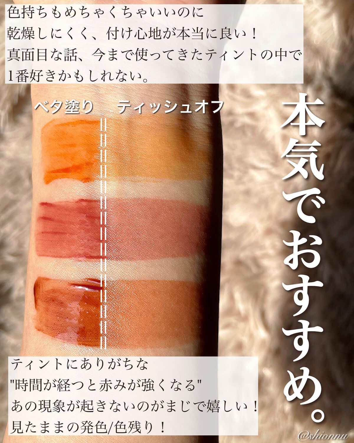 前からパケが可愛くて気になっていたローティント。 ミニサイズが出たので買いました。 イエベ秋におすすめなカラーだと言うので使ってみたのですが、黄み吸いの私にはほぼピンクに発色🥲 うるちゅる感は可愛いので、ピリピリや色落ちが気にならない人には良いと思います😊