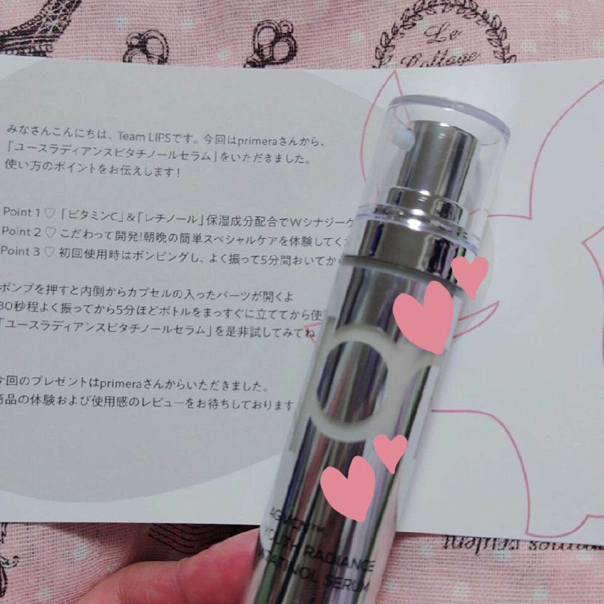 \使う直前に混ぜて完成させるセラム!/primeraユースラディアンスビタチノールセラムこちらはメーカー様から頂きお試し致しました。ありがとうございます。使用する直前に、レチノールとビタミンCを混ぜるセラム!ポンプをカチッとなるまでギュッと押...