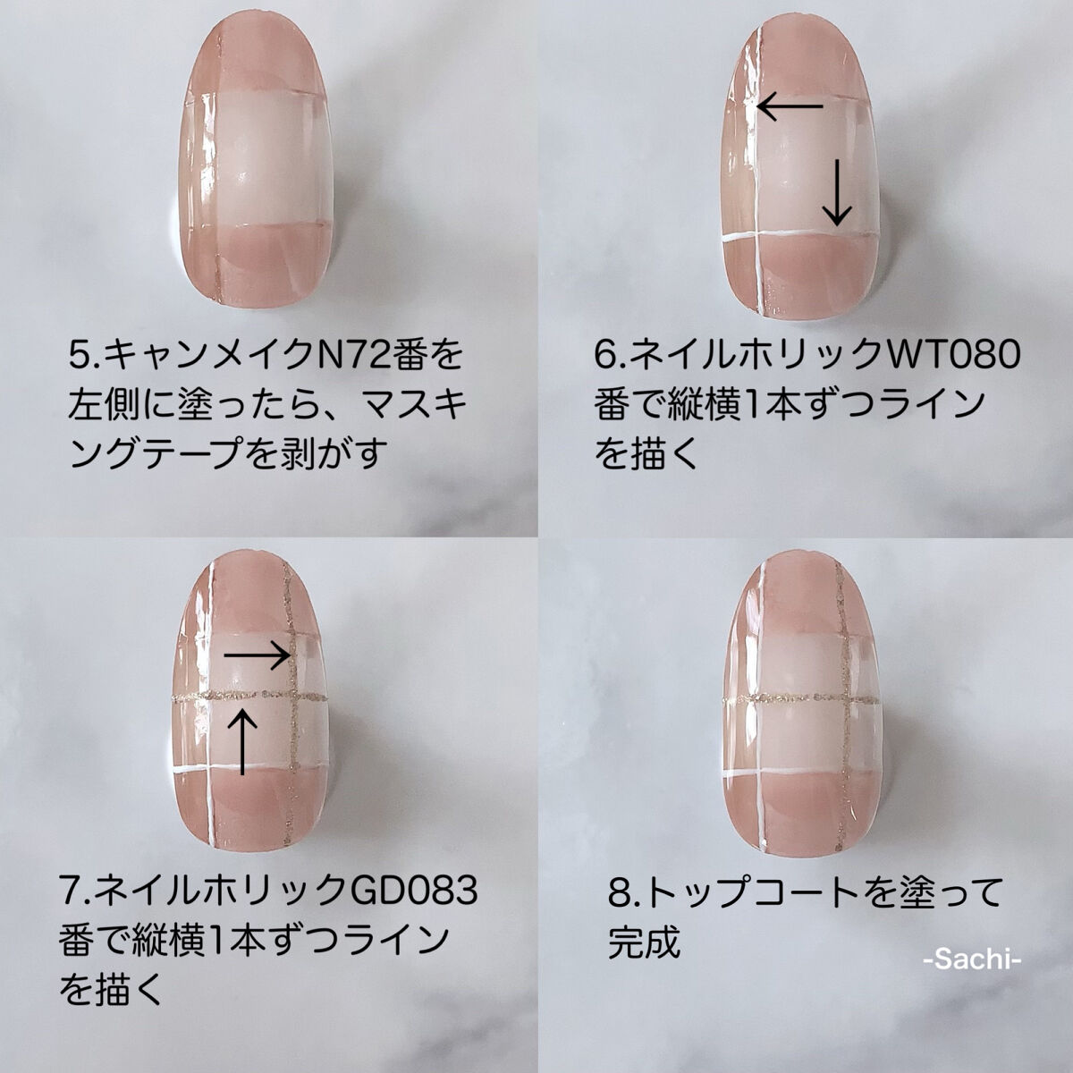 ワンカラーでも指ごとに色を変えるだけでオシャレに見えます💕 画像のようにゴールドラインとストーンを少し足すだけで華やかさがアップ🥰 何度かご紹介したことのあるスポンジで作るグラデーションです✨ スポンジを使うことで境目が綺麗に馴染んでくれます💕 アルミホイルの上でブラウンとトップコートを1:1くらいで混ぜたものを、トップコートのハケに取って3箇所に塗るだけ👌 事前に混ぜたものを塗ることで、爪の上でぼかすより簡単に出来ます💕 ベースカラーが乾く前に点置きしてぼかすことで綺麗にぼかせます✨ スピードが大事なので、使うポリッシュのキャップは全て開けておきましょう😊 天然石のラインはガタガタの方がより天然石っぽく見えるので、ラインを描くのが苦手な方でも大丈夫🙆♀️ 難しそうに見えて、やってみると意外と簡単に出来ます♡