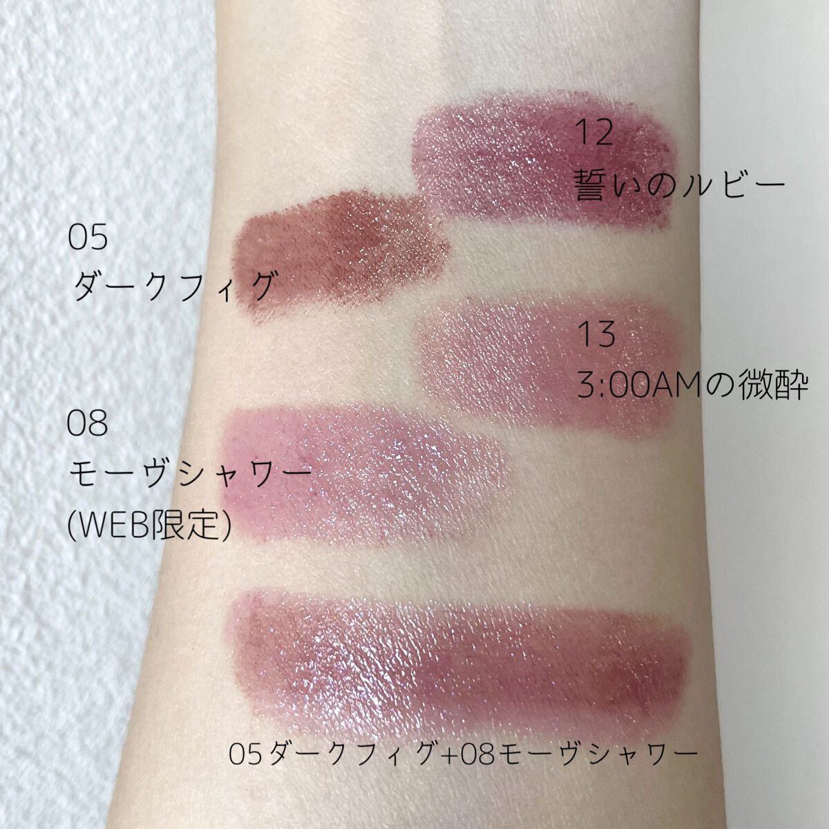 - <01 欲望の塊> テトライソステアリン酸ジペンタエリスリチル、トリ(カプリル酸/カプリン酸)グリセリル、オクチルドデカノール、ラウロイルグルタミン酸ジ(フィトステリル/オクチルドデシル)、ビスアルキル(C16-18)グリセリルウンデシルジメチコン、イソノナン酸イソトリデシル、水添ポリイソブテン、ラウロイルグルタミン酸ジ(オクチルドデシル/フィトステリル/ベヘニル)、パラフィン、合成ワックス、ダイマージリノール酸(フィトステリル/イソステアリル/セチル/ステアリル/ベヘニル)、マイクロクリスタリンワックス、水添マイクロクリスタリンワックス、ヒドロキシステアリン酸エチルヘキシル、トコフェロール、ホホバ種子油、オリーブ果実油、アーモンド油、(エチレン/プロピレン)コポリマー、ポリエチレン、ジメチコン、(+/-)(チタン/酸化チタン)焼結物、マイカ、ラウロイルアスパラギン酸Na、ラウロイルリシン、塩化亜鉛、酸化チタン、酸化鉄、水酸化Al、硫酸Ba、トリイソステアリン酸イソプロピルチタン、酸化スズ、ホウケイ酸(Ca/Al)、合成フルオロフロゴパイト、黄4、黄5、赤104(1)、赤201、赤202 <02 ピンクバナナ> テトライソステアリン酸ジペンタエリスリチル、トリ(カプリル酸/カプリン酸)グリセリル、オクチルドデカノール、ラウロイルグルタミン酸ジ(フィトステリル/オクチルドデシル)、ビスアルキル(C16-18)グリセリルウンデシルジメチコン、イソノナン酸イソトリデシル、水添ポリイソブテン、ラウロイルグルタミン酸ジ(オクチルドデシル/フィトステリル/ベヘニル)、パラフィン、合成ワックス、ダイマージリノール酸(フィトステリル/イソステアリル/セチル/ステアリル/ベヘニル)、マイクロクリスタリンワックス、水添マイクロクリスタリンワックス、ヒドロキシステアリン酸エチルヘキシル、トコフェロール、ホホバ種子油、オリーブ果実油、アーモンド油、(エチレン/プロピレン)コポリマー、ポリエチレン、ジメチコン、(+/-)(チタン/酸化チタン)焼結物、マイカ、ラウロイルアスパラギン酸Na、ラウロイルリシン、塩化亜鉛、酸化チタン、酸化鉄、水酸化Al、硫酸Ba、トリイソステアリン酸イソプロピルチタン、酸化スズ、ホウケイ酸(Ca/Al)、合成フルオロフロゴパイト、黄4、黄5、赤104(1)、赤201、赤202 <03 陽炎> テトライソステアリン酸ジペンタエリスリチル、トリ(カプリル酸/カプリン酸)グリセリル、オクチルドデカノール、ラウロイルグルタミン酸ジ(フィトステリル/オクチルドデシル)、ビスアルキル(C16-18)グリセリルウンデシルジメチコン、イソノナン酸イソトリデシル、水添ポリイソブテン、ラウロイルグルタミン酸ジ(オクチルドデシル/フィトステリル/ベヘニル)、パラフィン、合成ワックス、ダイマージリノール酸(フィトステリル/イソステアリル/セチル/ステアリル/ベヘニル)、マイクロクリスタリンワックス、水添マイクロクリスタリンワックス、ヒドロキシステアリン酸エチルヘキシル、トコフェロール、ホホバ種子油、オリーブ果実油、アーモンド油、(エチレン/プロピレン)コポリマー、ポリエチレン、ジメチコン、(+/-)(チタン/酸化チタン)焼結物、マイカ、ラウロイルアスパラギン酸Na、ラウロイルリシン、塩化亜鉛、酸化チタン、酸化鉄、水酸化Al、硫酸Ba、トリイソステアリン酸イソプロピルチタン、酸化スズ、ホウケイ酸(Ca/Al)、合成フルオロフロゴパイト、黄4、黄5、赤104(1)、赤201、赤202 <04 パンプキンワイン> テトライソステアリン酸ジペンタエリスリチル、トリ(カプリル酸/カプリン酸)グリセリル、オクチルドデカノール、ラウロイルグルタミン酸ジ(フィトステリル/オクチルドデシル)、ビスアルキル(C16-18)グリセリルウンデシルジメチコン、イソノナン酸イソトリデシル、水添ポリイソブテン、ラウロイルグルタミン酸ジ(オクチルドデシル/フィトステリル/ベヘニル)、パラフィン、合成ワックス、ダイマージリノール酸(フィトステリル/イソステアリル/セチル/ステアリル/ベヘニル)、マイクロクリスタリンワックス、水添マイクロクリスタリンワックス、ヒドロキシステアリン酸エチルヘキシル、トコフェロール、ホホバ種子油、オリーブ果実油、アーモンド油、(エチレン/プロピレン)コポリマー、ポリエチレン、ジメチコン、(+/-)(チタン/酸化チタン)焼結物、マイカ、ラウロイルアスパラギン酸Na、ラウロイルリシン、塩化亜鉛、酸化チタン、酸化鉄、水酸化Al、硫酸Ba、トリイソステアリン酸イソプロピルチタン、酸化スズ、ホウケイ酸(Ca/Al)、合成フルオロフロゴパイト、黄4、黄5、赤104(1)、赤201、赤202 <05 ダークフィグ> テトライソステアリン酸ジペンタエリスリチル、トリ(カプリル酸/カプリン酸)グリセリル、オクチルドデカノール、ラウロイルグルタミン酸ジ(フィトステリル/オクチルドデシル)、ビスアルキル(C16-18)グリセリルウンデシルジメチコン、イソノナン酸イソトリデシル、水添ポリイソブテン、ラウロイルグルタミン酸ジ(オクチルドデシル/フィトステリル/ベヘニル)、
