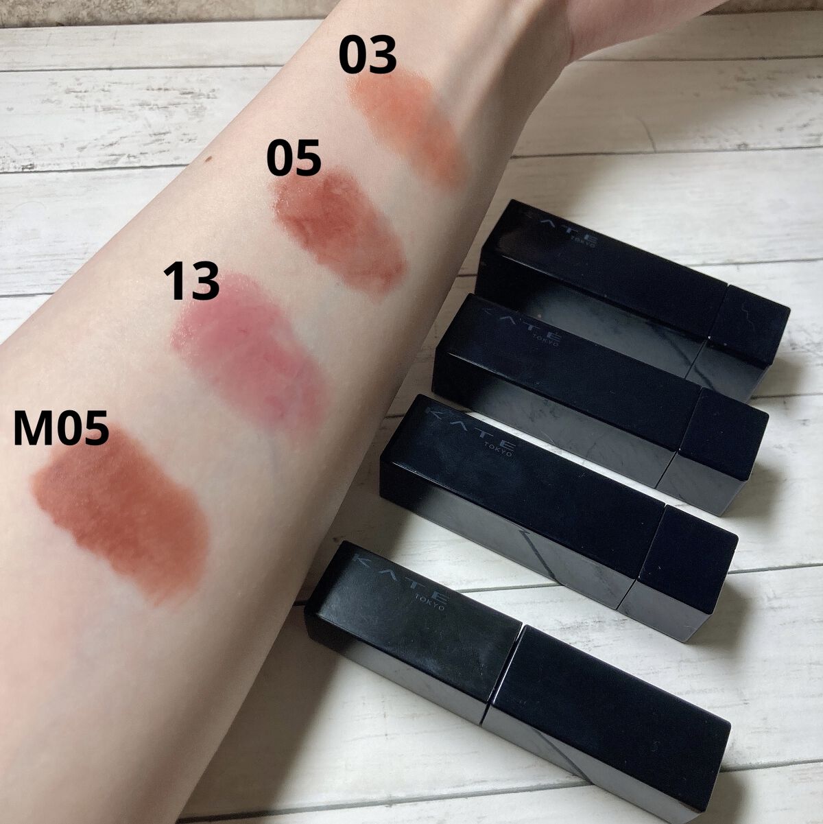 私は𝟭𝘀𝘁ブルベ夏 𝟮𝗻𝗱イエべ秋のくすみが得意なタイプで、03,05,M05が自分で買ったカラー、13は母に貰ったカラーです。 03 陽炎 リップモンスターで1番淡い、オレンジベージュカラーのリップです。 05 ダークフィグ くすみの強い赤みブラウン…?色味の表現が難しいのですが、見た目より黄みは少なく、ブルベ向けブラウンのようなイメージで使っています。 13 3:00AMの微酔 母が「買ったけど似合わないからあげる」とくれた色です。かなり青みが強いです。 マットタイプ 05 泥霧 私は唇が年中ガサガサなのでマットタイプは大体苦手なのですが、リップモンスター好きなのでマットタイプも試してみようと思って買ったのがこちらです。