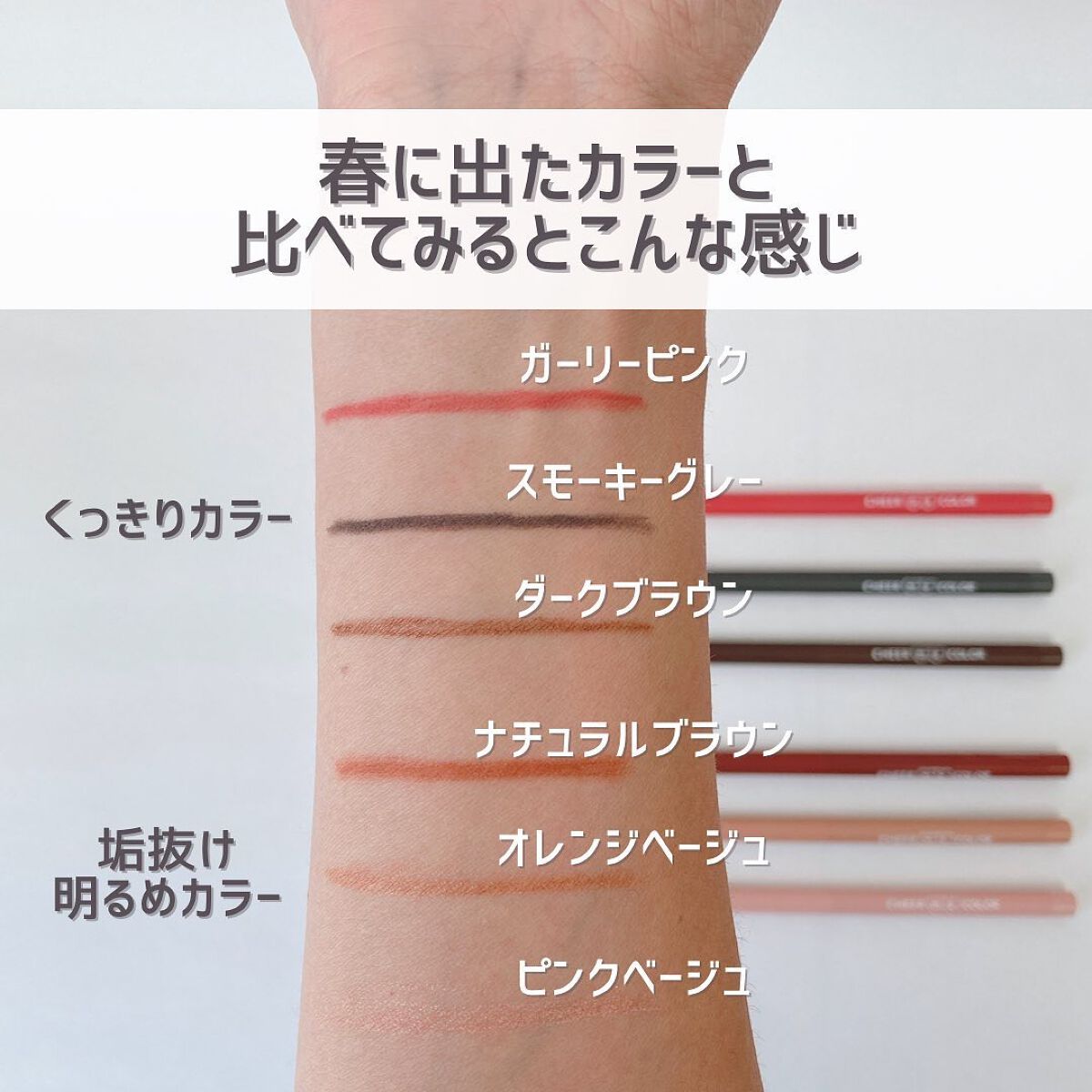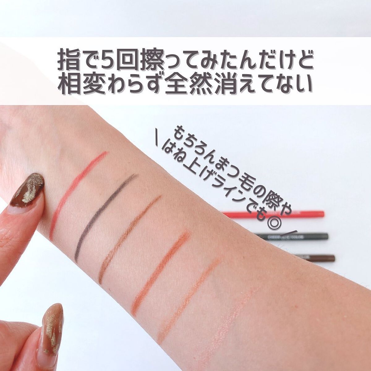 フェルトタイプのアイライナーって苦手な方も多いと思うんだけど、ハリがあるからまぶたの上はもちろん目尻も結構描きやすかった🥰 どれも使いやすいカラーだし、グレイッシュブラウンとか抜け感が出せてオシャレ🙈💕︎ めっちゃ擦ってみたけど全然取れないし 水をつけて擦っても取れなくてほんとビックリ😳 目元でも1日全然消えてなかった🙌🏻 擦れにも強いからまぶたで擦れて メイクが崩れやすいって方にもピッタリだよ🤎