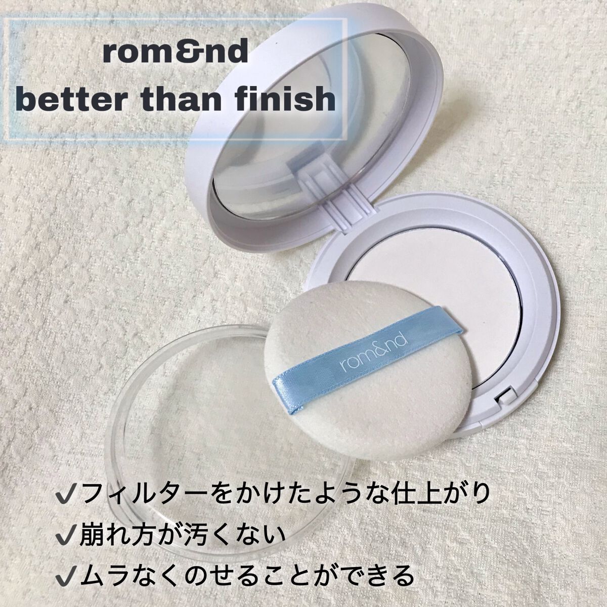 rom&ndべターザンフィニッシュ総評👉とにかくサラサラ、オイリー感が無くなる乾燥肌さんはきついかも混合肌の私の場合、全顔にパウダーをパフでのせると乾燥しすぎて顔がパキパキになったから、付属のブラシでふわっとのせるのが1番合っていた(オイリー...