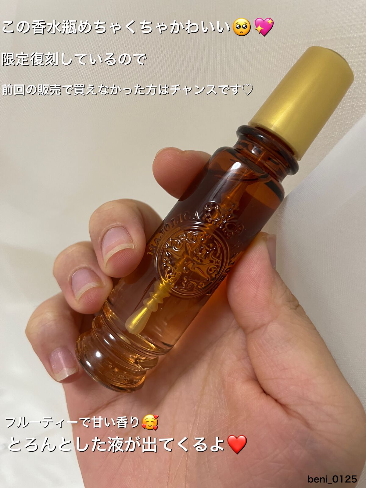 - 数量限定発売 とろ~り一滴で「女の子」の血が騒ぐ魅力溢れる魔法の媚薬 浜辺美波さん監修の限定品! ○煮詰めたようなとろみのある香水です。 ○シュガートリックの香り ‐彩り豊かな果実に焦がしたシュガー、小花の香りを添えて、甘いのに大人っぽい、まるで魔法の媚薬のような「女の子」の血が騒ぐ香り