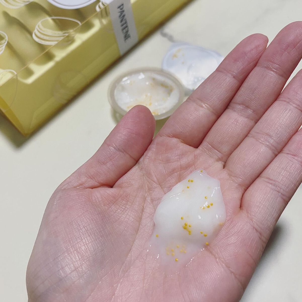 - 「パンテーン マカロン ヘアマスク」は、1粒に1回分の洗い流すトリートメントがたっぷり詰まった、使い切りタイプのヘアマスクです。 マカロンのようなカプセル型のユニークなパッケージの可愛さのみならず、個包装の使い切りタイプによる3つの特長で、たった1粒で、ずっと続く、うるおいつめく髪/色つや髪へ導きます。 1.1粒にたっぷりの洗い流すトリートメントをギュッと濃縮。すぐに感じる、もっとまとまる髪へ! 「パンテーン マカロン ヘアマスク」は、1粒にたっぷり12mLの洗い流すトリートメントが入っています。様々な髪の長さ、量の方でも髪の内側までしっかりと塗布することができ、効果を発揮します。 たっぷりの量を使用することで、髪のまとまり感がアップ。 2.いつでも開けたて、フレッシュな洗い流すトリートメント カプセル型のパッケージに入った個包装の1回使い切りなので、いつでも開けたてのフレッシュさ。 毎回、使う直前に手のひらで“メルティうるおいパール*”を混ぜ合わせて、1粒で、長時間続くうるおいつやめく髪へ。(うるつやリッチのみ) *黄色いカプセルのこと 3.個包装だから持ち運びOK。いつでもどこでも、うるつや髪・色つや髪に 日々のケアはもちろん、1粒ずつ持ち運ぶことが出来るので、ジムやサウナ、お泊り会、旅行・出張など、様々なシーンで使うことが出来ます。いつでも・どこでもうるつや髪/色つや髪に。