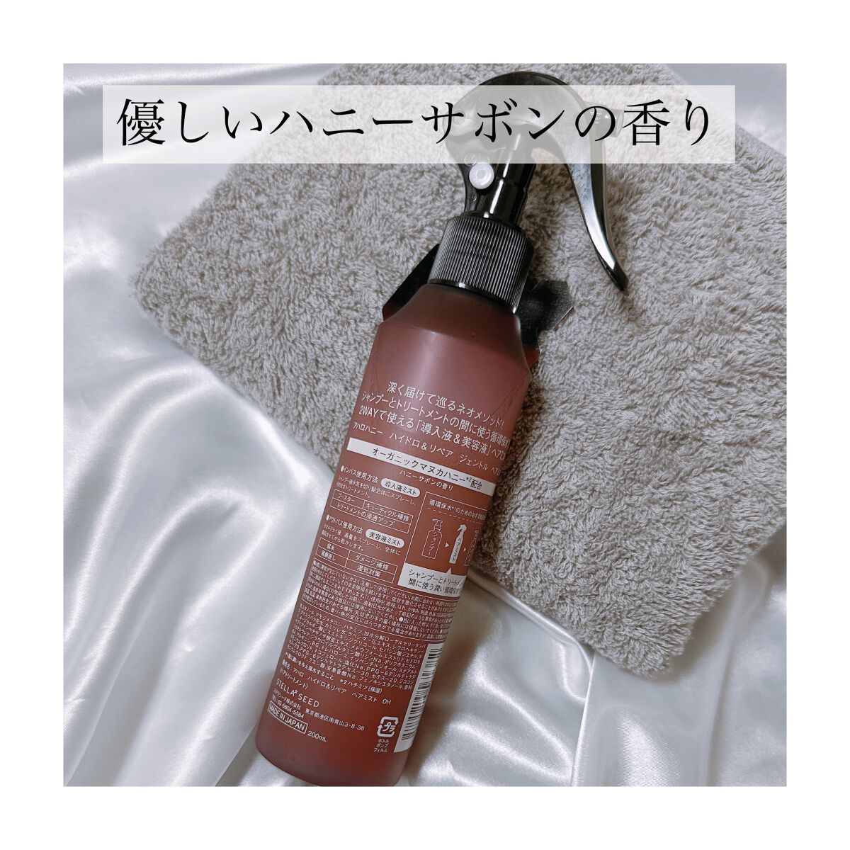 - 深く届けて潤い巡るアハロ式ネオメソッドアイテムが登場!シャンプーとトリートメントの間に使うだけで髪の質感が変わる*1ヘアミスト。オーガニックのマヌカハニー*2配合で、水分パックするように芯まで潤す2WAYで使える循環保水*3液。インバスでは、シャンプーとトリートメントの間に使う「導入液ミスト」として使うことで、補修をしながら次のトリートメントの浸透をサポート!また、アウトバスでは、「美容液ミスト」として潤いを与える保水ミストや、寝癖直しやうねり・湿気対策等も叶えるマルチなアイテムとしてお使いいただけます。ハニーサボンの香り。 *1 潤い・まとまりなどの髪の仕上がりや手触りのこと *2ハチミツ(保湿) *3 髪に潤いを与え保水すること