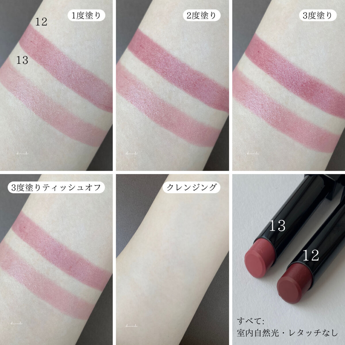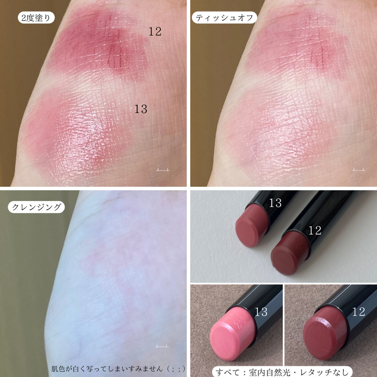 するする塗れて潤うのに高発色、 SPF20 PA++、無香料。 うるみが可愛い反面、 マスクにはつきやすいかも⚠️ 私は単体使いの他に、 同系色のリップ (ティント効果があるものや乾燥しやすいもの) に重ねて保湿を補ったりします🌸 ⚪️カメリアピンク The・青みピンク! うるうる可愛い唇に💕 ⚪️ラズベリーピンク 青みピンクでも大人っぽくお姉さんな色。 発色も良く華やか🙆♀️ ⚪️シアーレッド シアーで強すぎないレッド。 ほどよい血色感がプラスできて、 ヘルシーなメイクが叶う☀️ ⚪️ボルドー 赤みブラウンで使いやすい◎ 秋先にはこれを使いたくなります🍁 公式サイトにはカラーチャートもあり、 バーチャルメイクもできます🤍 カラバリは8色。 お気に入りを見つけやすいかなと思います😉 唇が荒れている時、乾燥気味のときに◎ 常にポーチに入れておきたい。 さっと使える万能リップです💄